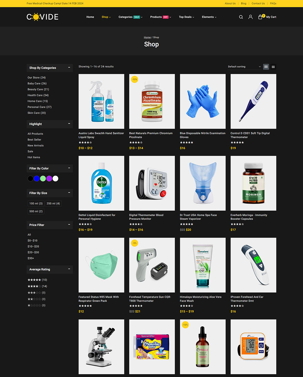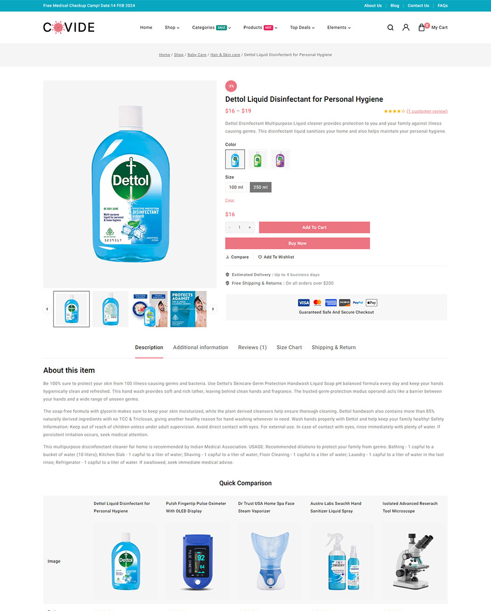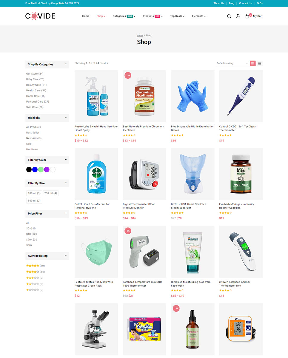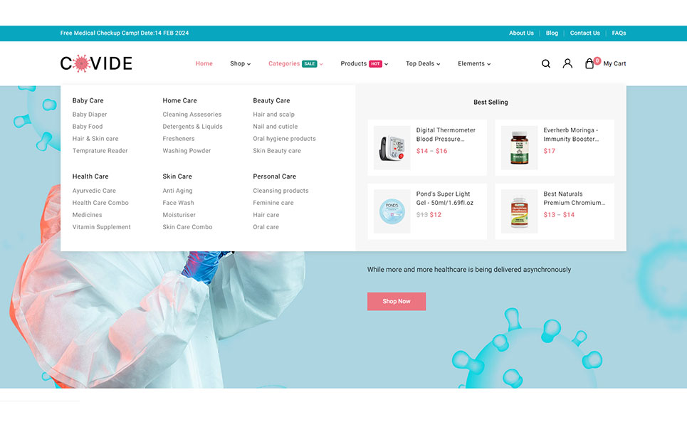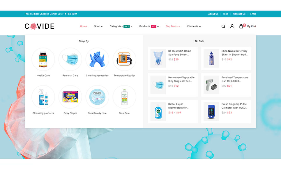 COVIDE is a specialized WooCommerce theme tailored for medical and healthcare stores, designed to provide a seamless online shopping experience for customers looking for Covid-19 kit, Mask & Sanitizer, Medical Equipment, Drugs, Medicine, Pharmacy store, healthcare-related products. The theme's design is tailored specifically for medical and healthcare stores, with clean and professional layouts that instill trust and credibility in your brand. The color scheme, typography, and imagery are chosen to reflect the seriousness and reliability associated with the healthcare industry.