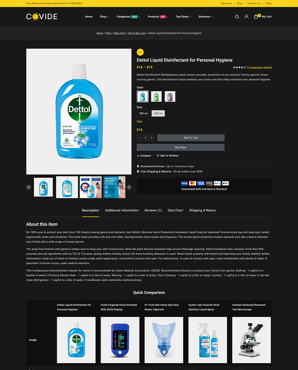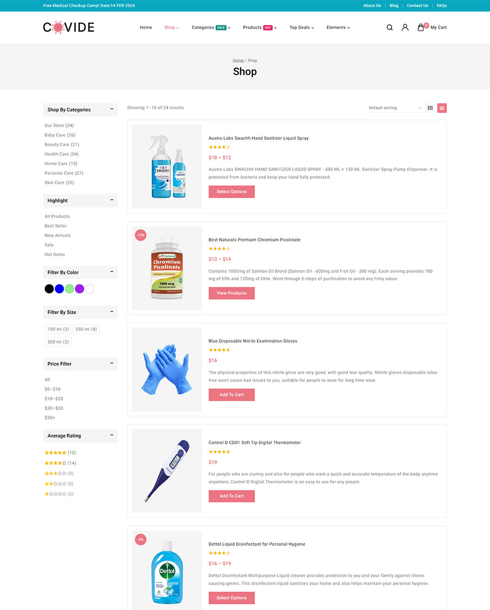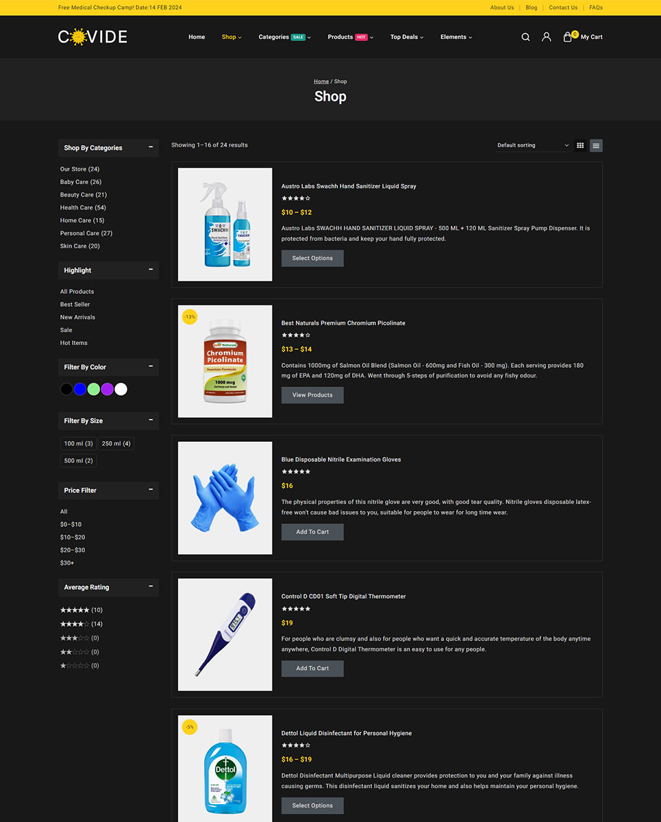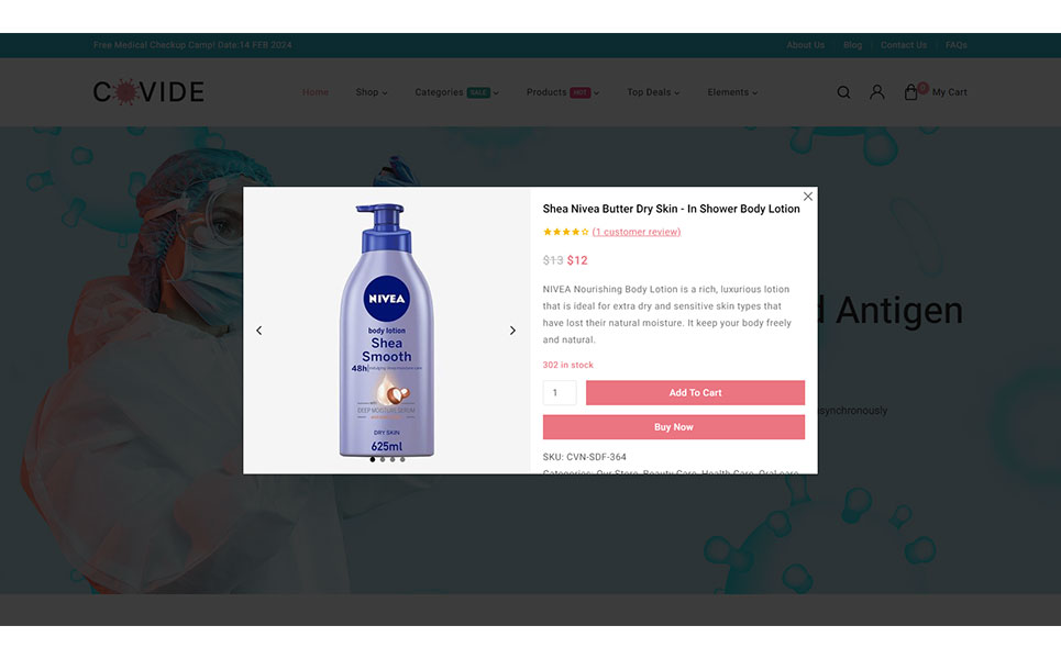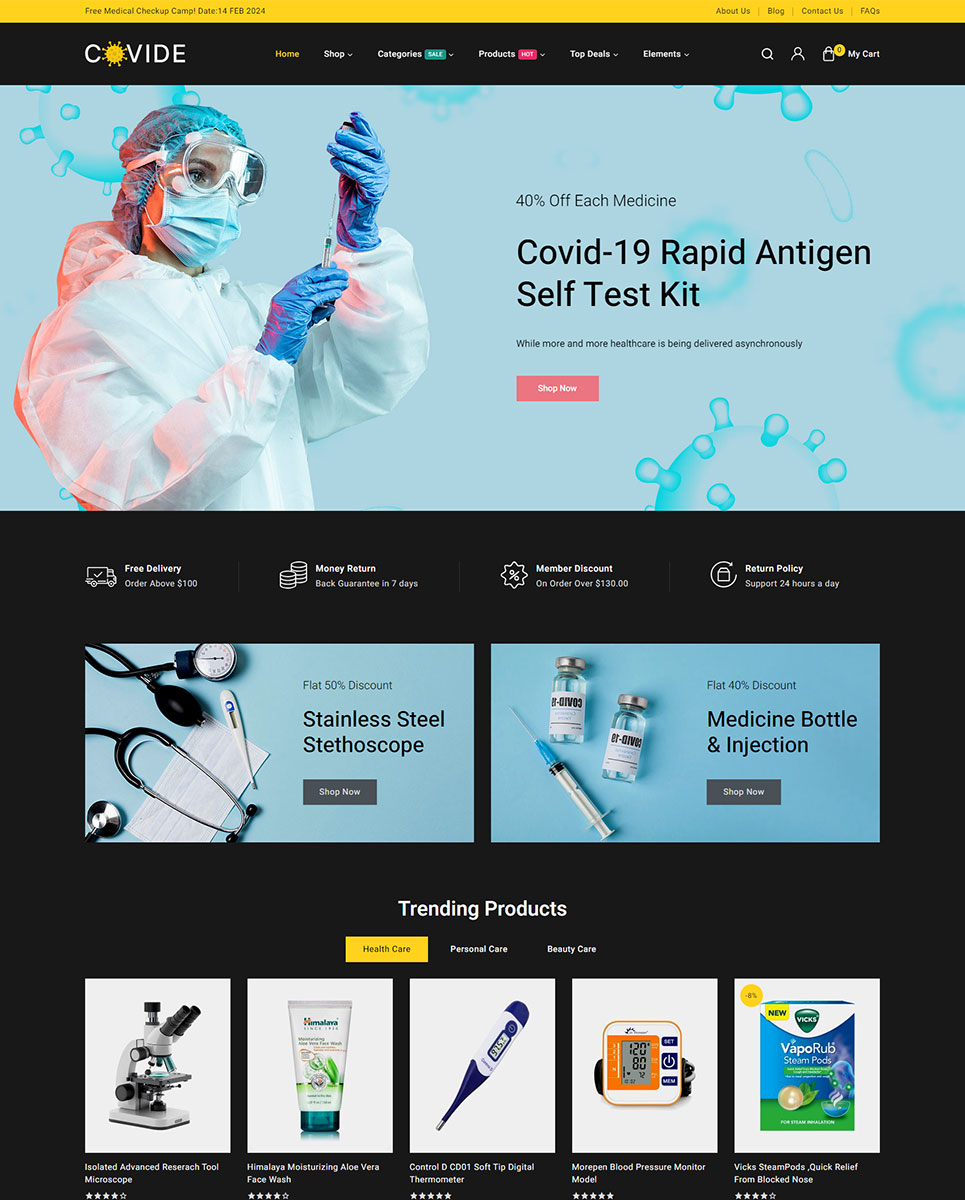COVIDE is a specialized WooCommerce theme tailored for medical and healthcare stores, designed to provide a seamless online shopping experience for customers looking for Covid-19 kit, Mask & Sanitizer, Medical Equipment, Drugs, Medicine, Pharmacy store, healthcare-related products. The theme's design is tailored specifically for medical and healthcare stores, with clean and professional layouts that instill trust and credibility in your brand. The color scheme, typography, and imagery are chosen to reflect the seriousness and reliability associated with the healthcare industry.