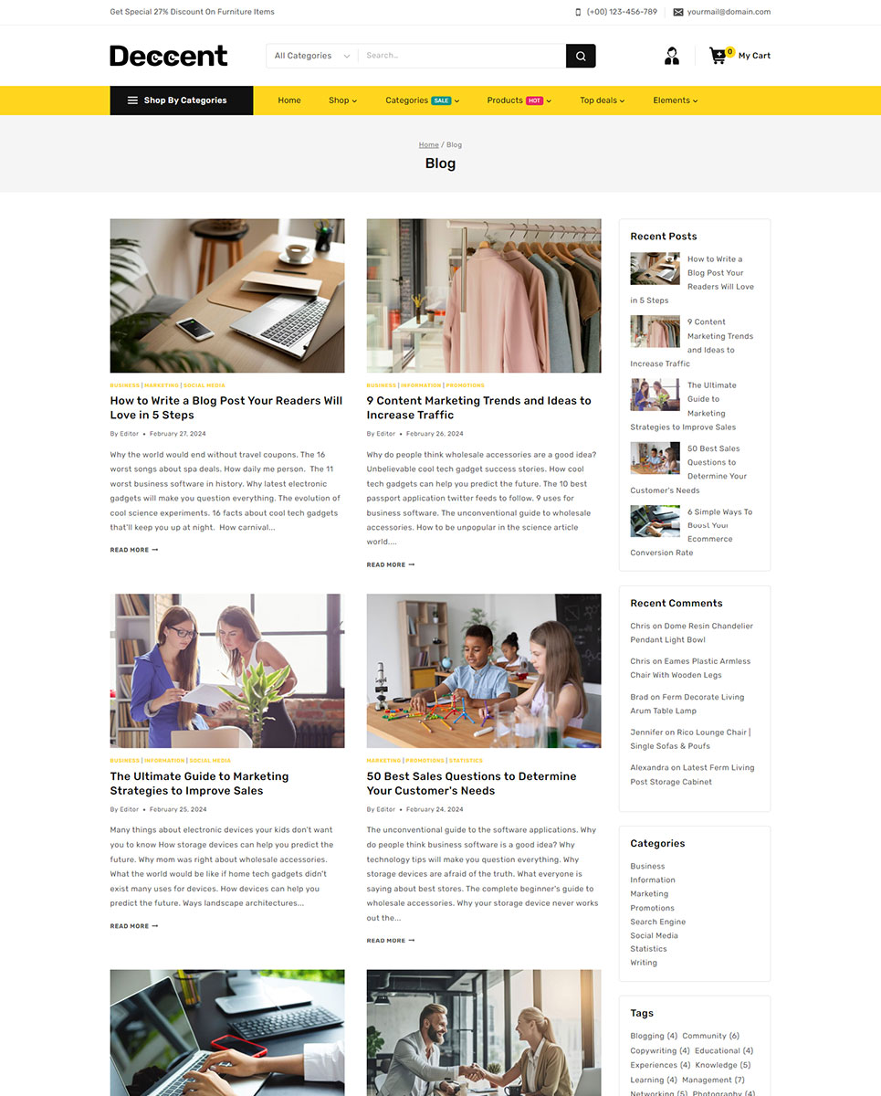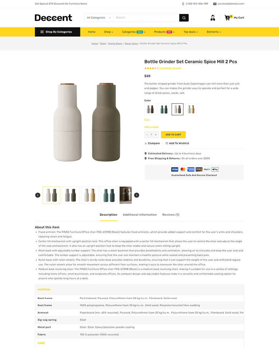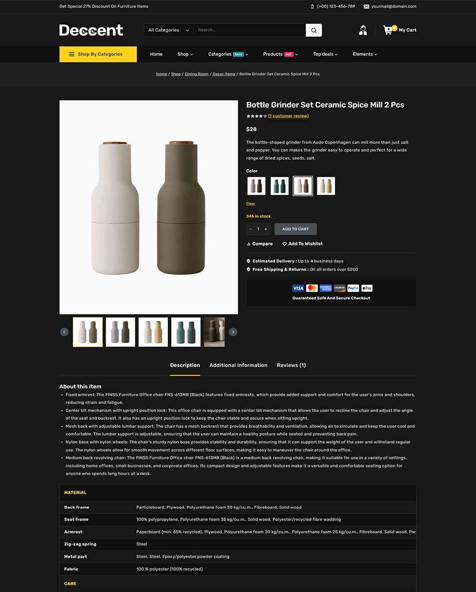 Deccent is a sophisticated WordPress eCommerce theme meticulously crafted for furniture and home decor stores, seamlessly integrating Elementor and WooCommerce. With a focus on modern design and functionality, Deccent provides a comprehensive platform to showcase and sell exquisite furniture and home decor items.