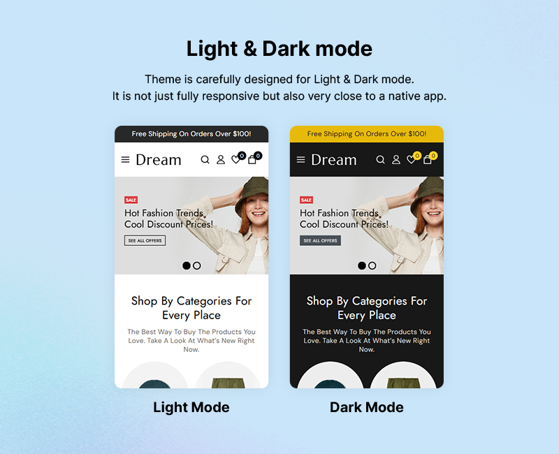 Dream features a clean, trendy design with refined typography, ample white space, and an intuitive layout that keeps your products in focus. Its fully responsive and mobile-optimized interface ensures your store looks flawless on all devices—delivering a seamless experience to shoppers whether they browse on desktop or mobile.