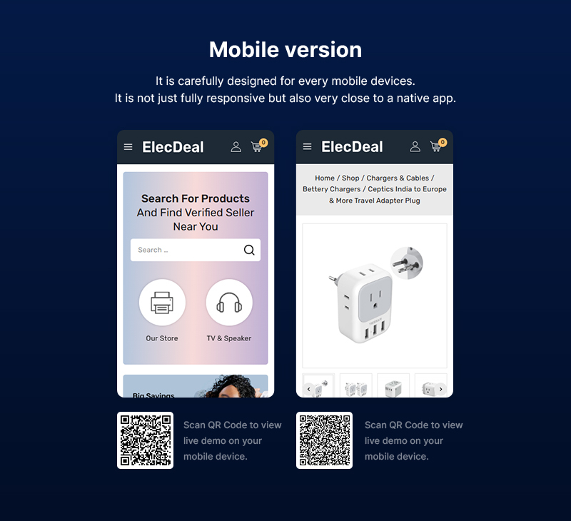 ElecDeal’s design is bold, clean, and product-focused, giving your store a high-end tech retail vibe. From the intuitive homepage layout to the stylish category grids, every element is designed to help you showcase your latest gadgets, deals, and top-selling products. Fully responsive and mobile-optimized, your store looks pixel-perfect on all devices.