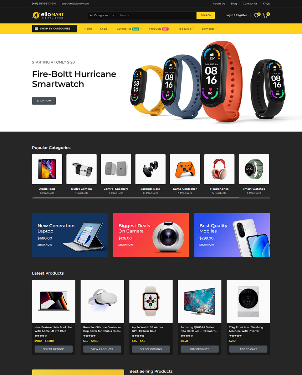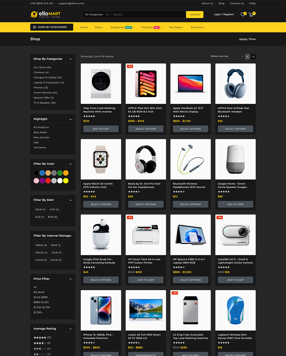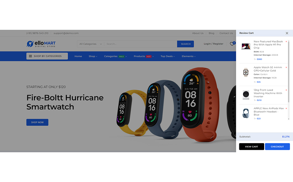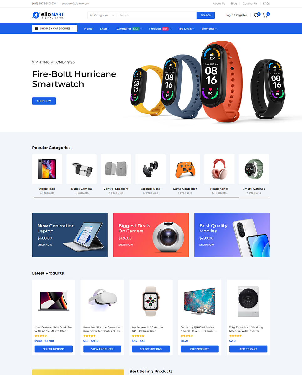 Ellomart is a cutting-edge WordPress eCommerce theme specifically designed for electronics and digital product stores. Theme offers a sleek, modern design and a plethora of features tailored to enhance the e-commerce experience. Ellomart features a contemporary design that is perfect for showcasing electronic items such as computers, mobile phones, televisions, laptop computers, speakers, cameras, CCTV, gadgets, and accessories.