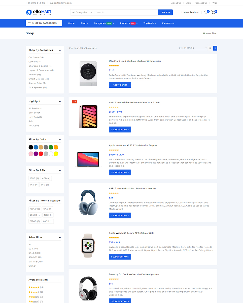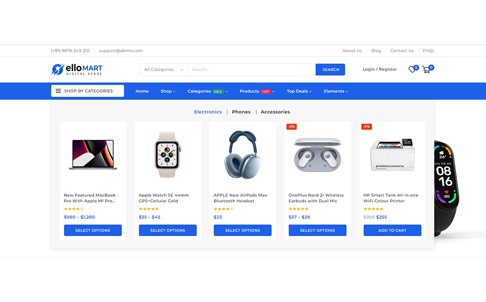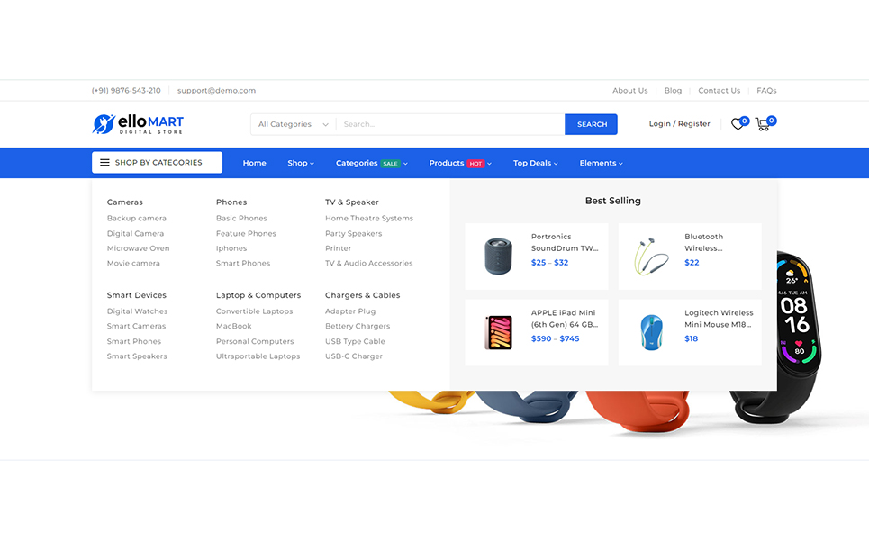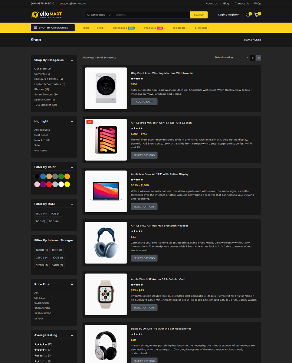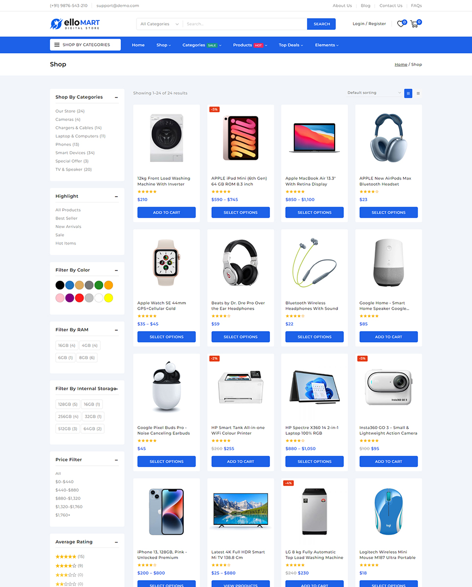 Ellomart is a cutting-edge WordPress eCommerce theme specifically designed for electronics and digital product stores. Theme offers a sleek, modern design and a plethora of features tailored to enhance the e-commerce experience. Ellomart features a contemporary design that is perfect for showcasing electronic items such as computers, mobile phones, televisions, laptop computers, speakers, cameras, CCTV, gadgets, and accessories.