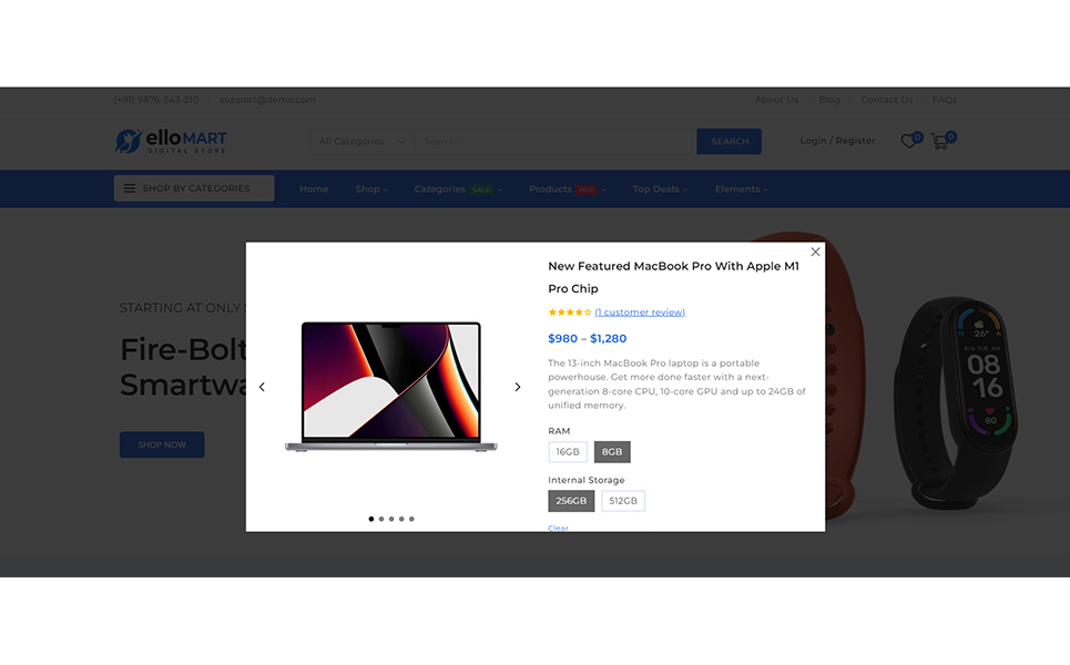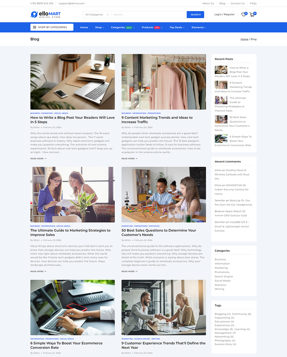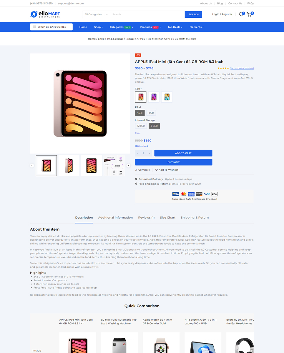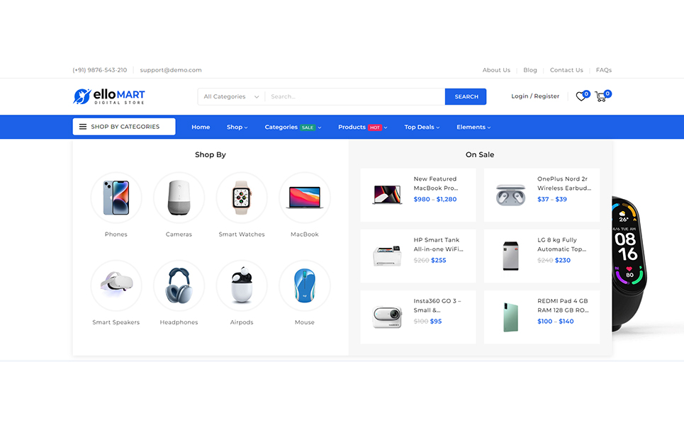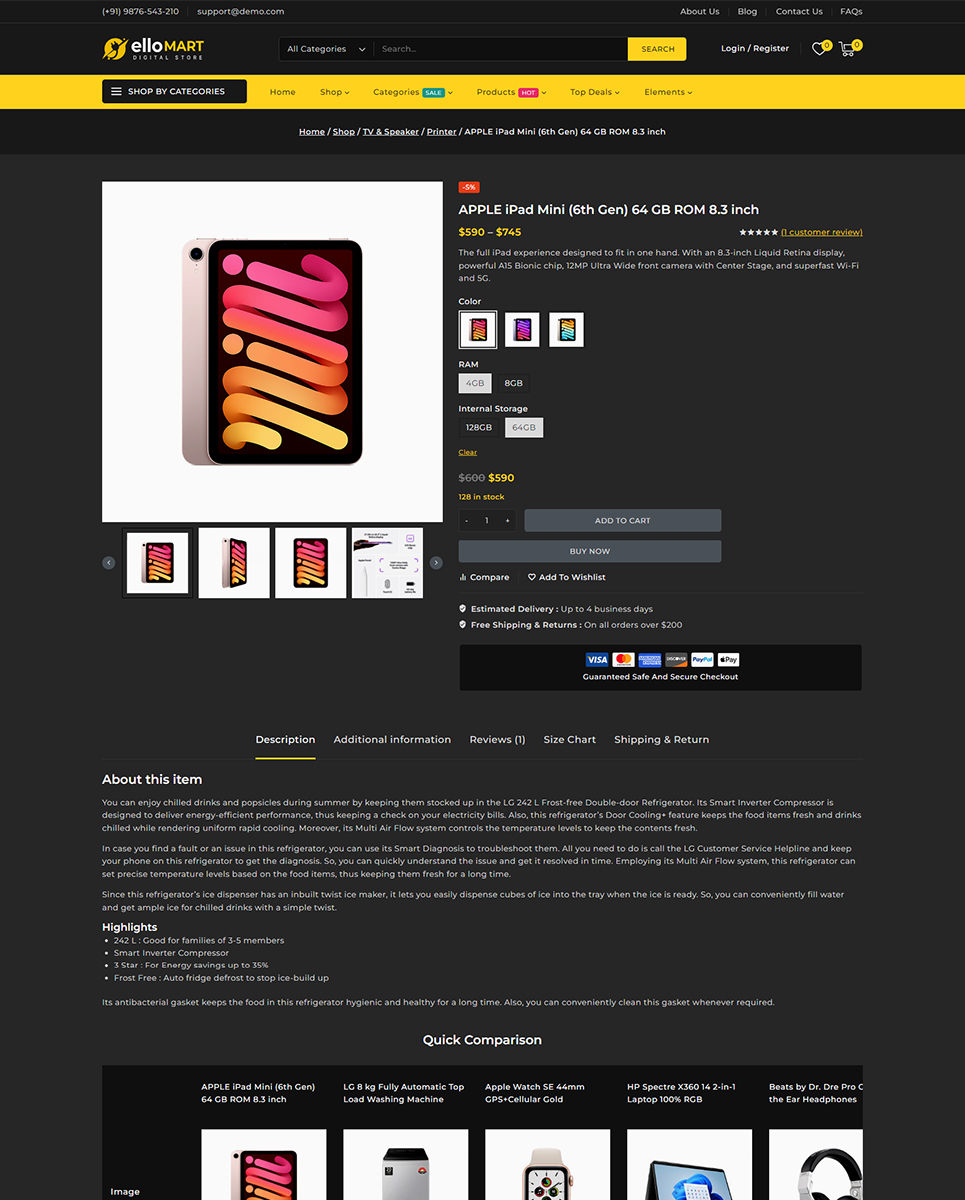 Ellomart is a cutting-edge WordPress eCommerce theme specifically designed for electronics and digital product stores. Theme offers a sleek, modern design and a plethora of features tailored to enhance the e-commerce experience. Ellomart features a contemporary design that is perfect for showcasing electronic items such as computers, mobile phones, televisions, laptop computers, speakers, cameras, CCTV, gadgets, and accessories.