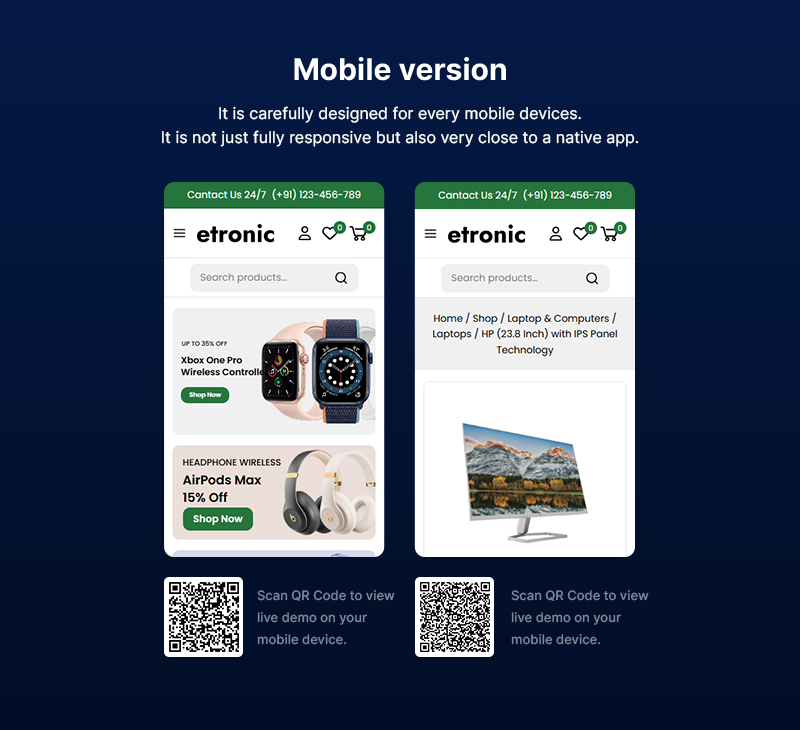 Built with performance in mind, Etronic loads fast and runs smoothly across all modern browsers. Its responsive design ensures your store looks and functions perfectly on desktops, tablets, and smartphones, giving mobile shoppers the same great experience.