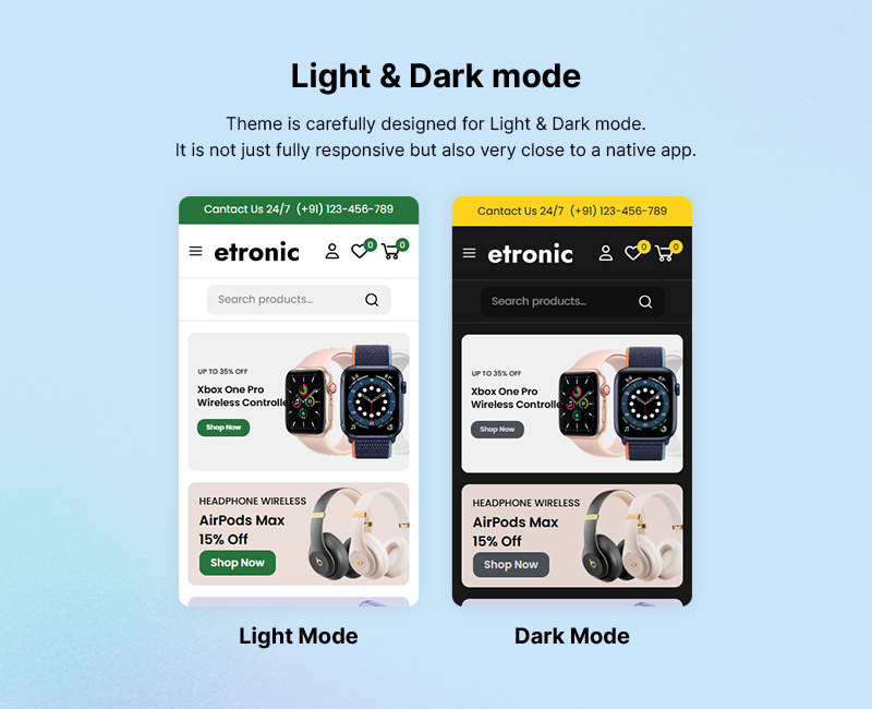 Customization is made simple with full Elementor integration. Easily edit homepage blocks, banners, product sections, and more using a drag-and-drop interface. Whether you're a beginner or an experienced developer, Etronic empowers you to tailor your store’s look and feel to fit your brand.