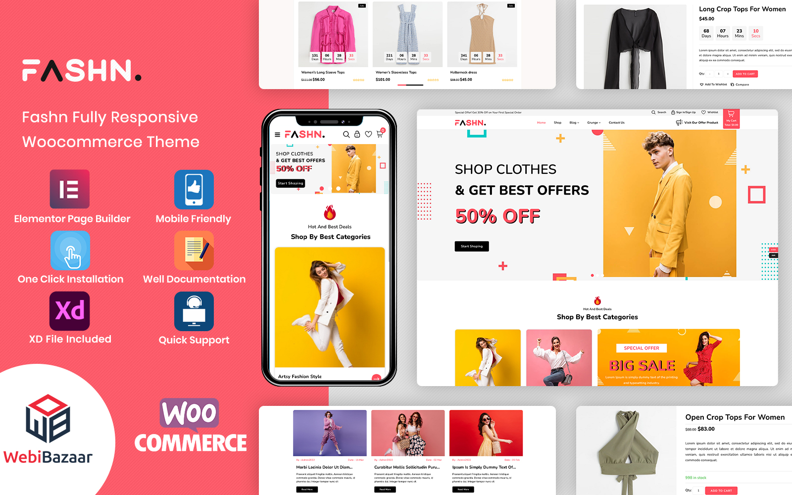 Fashn is pre-made layouts for different types of business like fashion store clean design, megamenu, Mobile responsive, one click demo import, figma file attach, Meta slider, tested on cross browser, dynamic theme, different design choice, used google fonts, SEO ready, well documentation, products slider, no programming required, advance filter, multiple currencies, artist portfolio, different blog design, cms content, fast installation service, tab products, category wise selection, elementor page builder, buyers testimonial, painting portfolio, creative artist profile, latest news, important links and tags on footer, contact information, other pages with design, eCommerce ready.