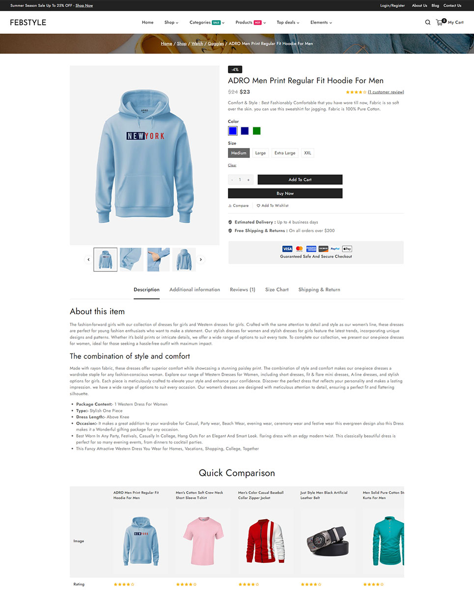The Ajax filter option enables customers to filter products by various attributes such as color, size, price, and more without needing to reload the page. This provides a smooth and efficient shopping experience. The quick compare feature available on product detail page, lets customers compare multiple products side by side, making it easier for them to evaluate options and choose the best product for their needs.