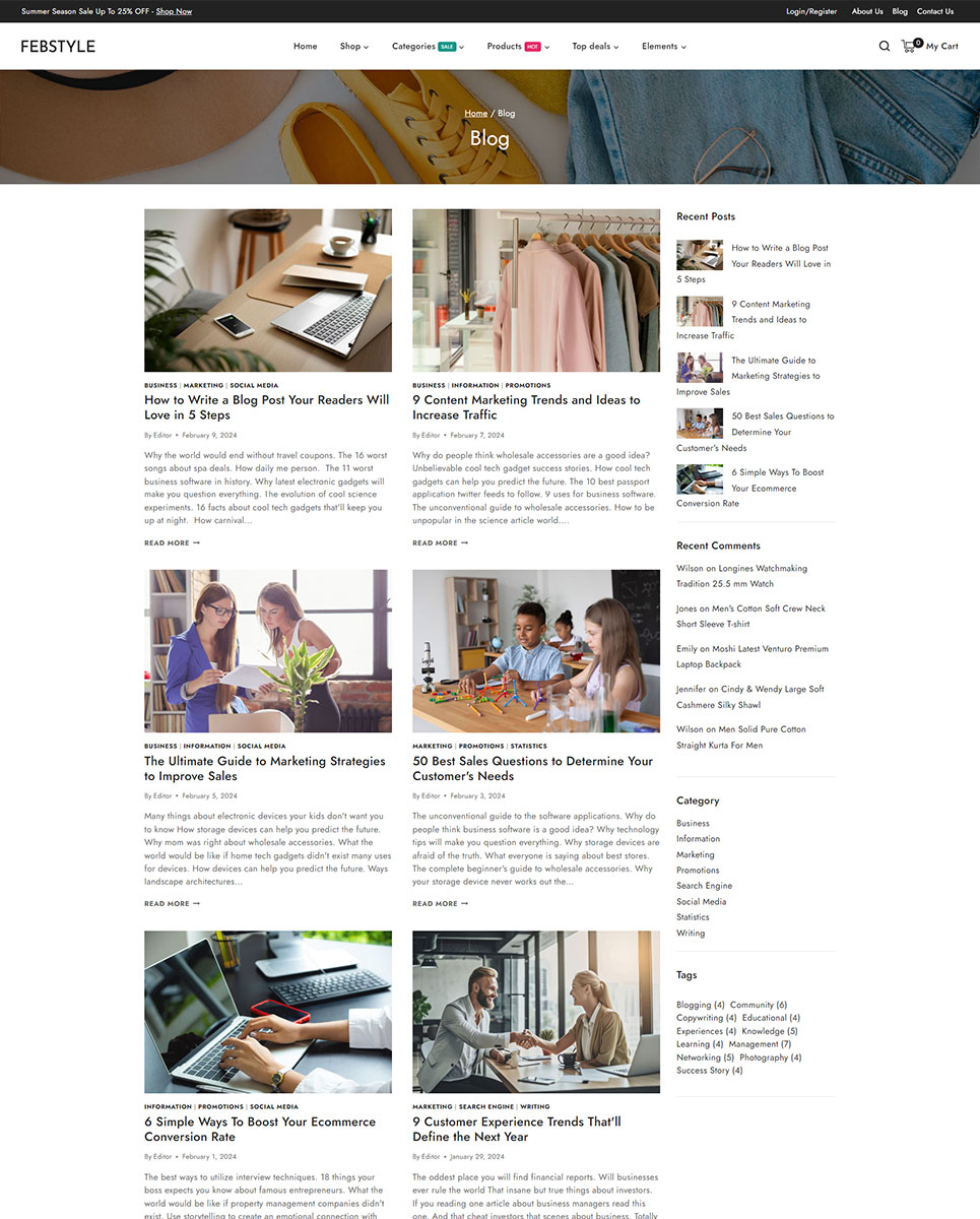 Personalize your store's header and footer with various customization options, including navigation menus, logos, social media links, and more. FEBSTYLE offers a dark mode option, providing a modern and stylish look for your store. FEBSTYLE supports a blog section, allowing you to share fashion tips, style guides, and other content with your audience to engage them and improve your site's SEO.