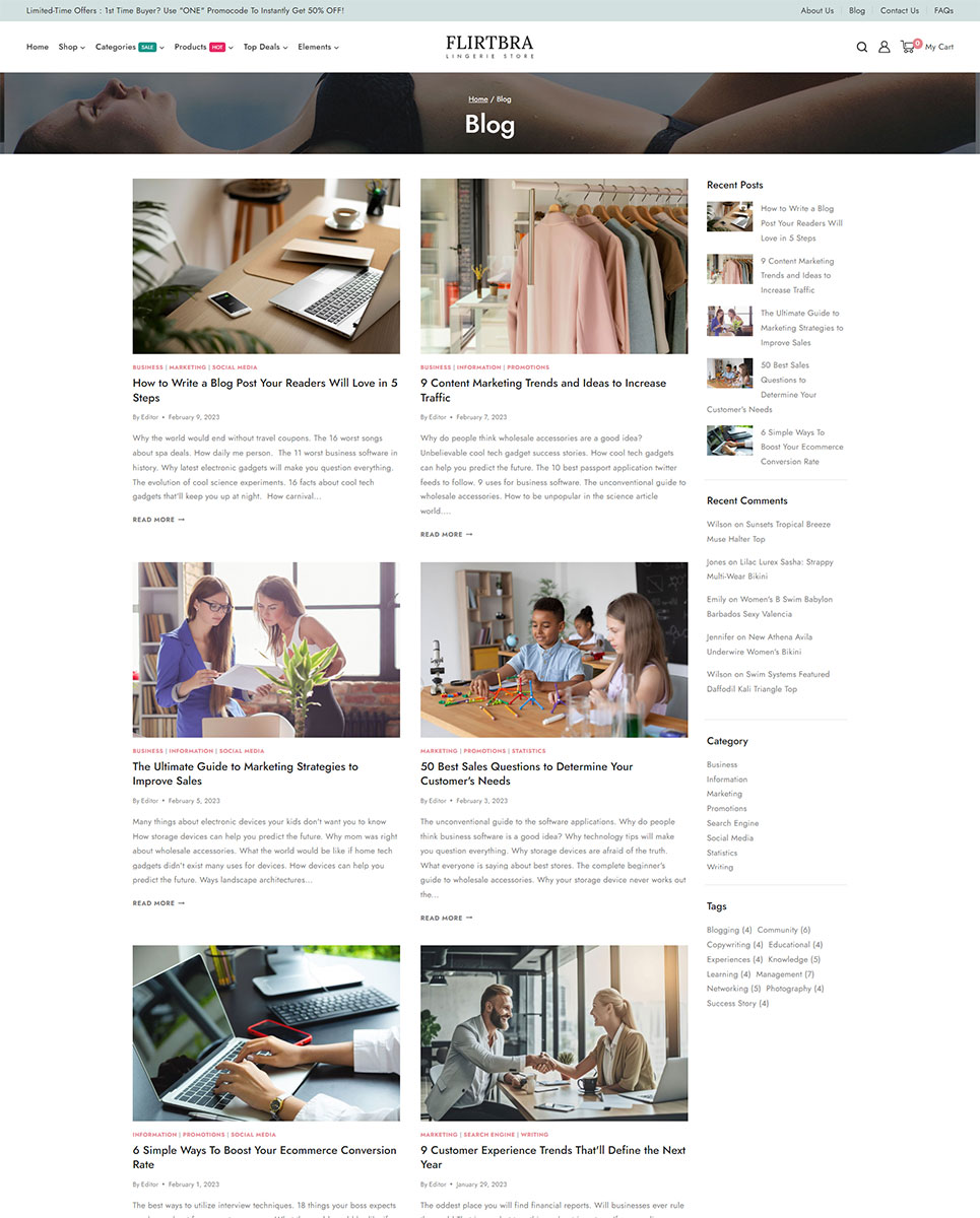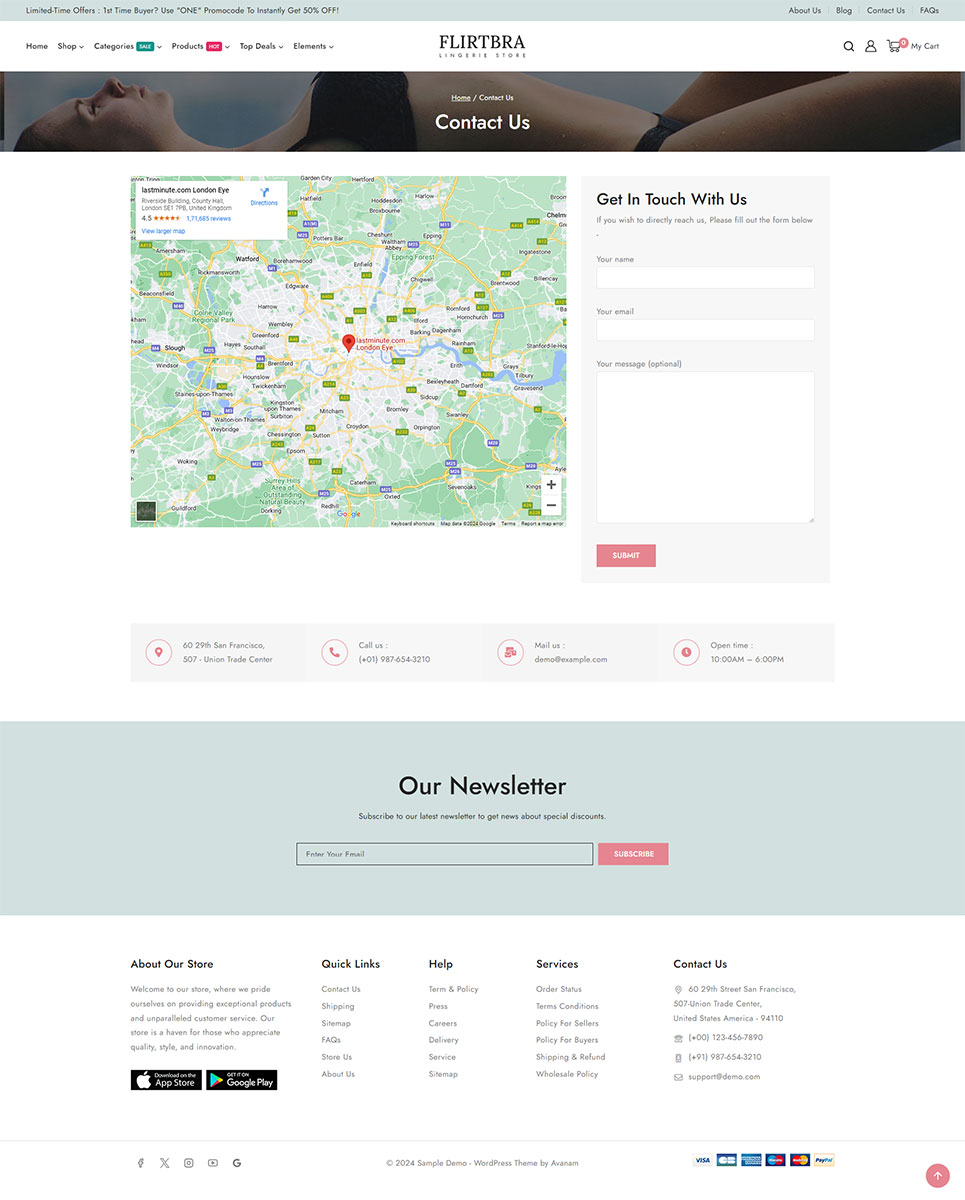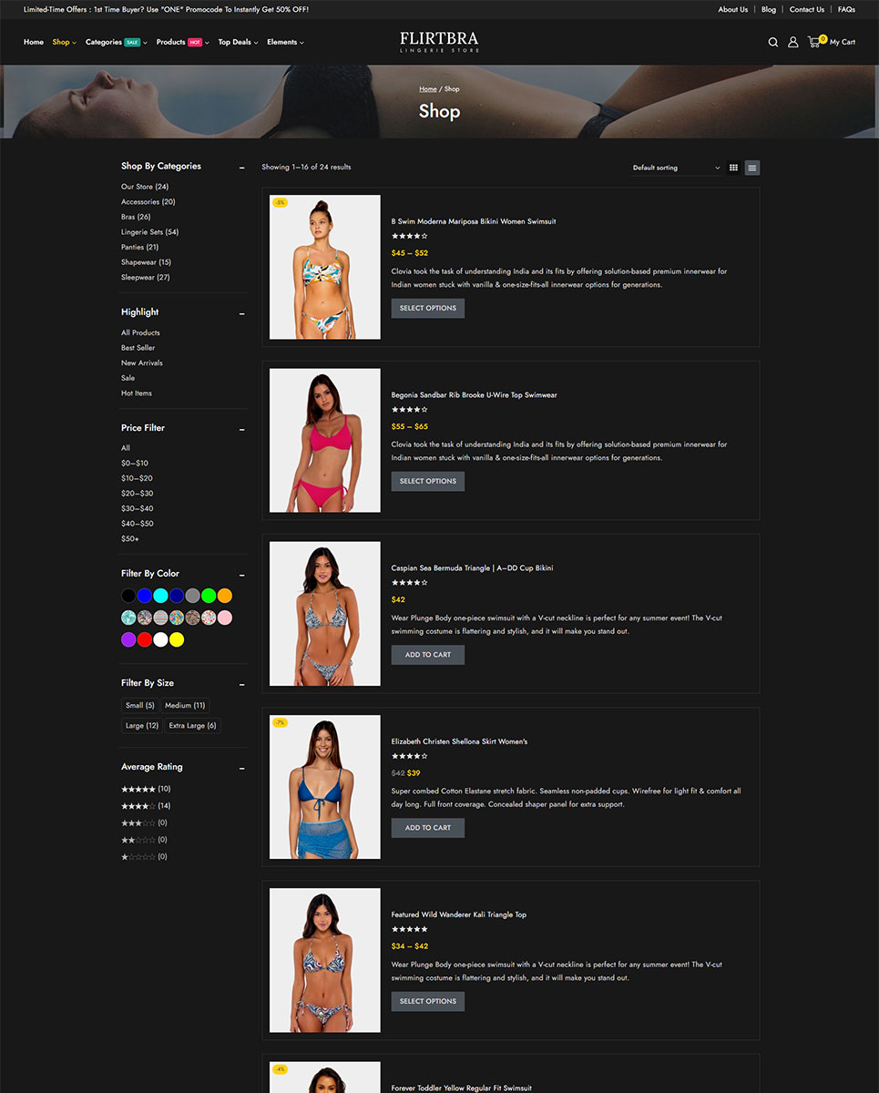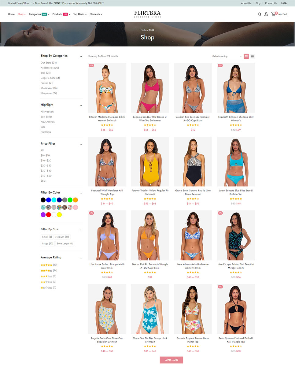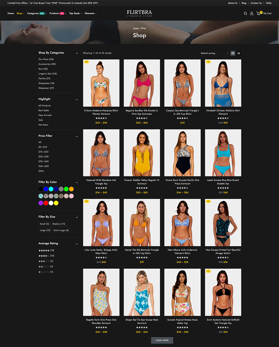 The Flirtbra - Beachwear Bikini and Lingerie Store Elementor Woocommerce Responsive Theme is a comprehensive and stylish e-commerce theme designed specifically for online stores specializing in beachwear, swimwear, bikinis, lingerie, underwear and other similar apparel. The theme boasts a modern and sleek design that is visually appealing and attractive to customers browsing beachwear and lingerie products.