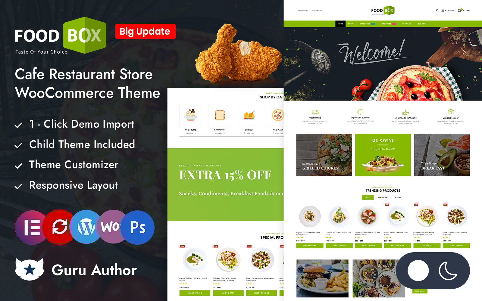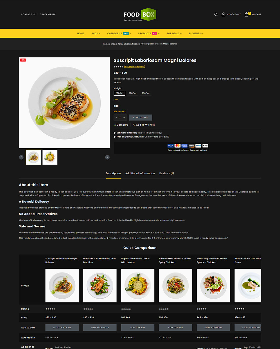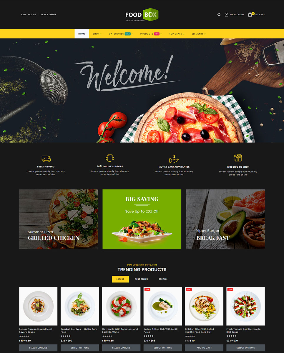 Food Box stands as a dynamic and feature-rich WordPress theme tailored specifically for restaurants and cafes. It's also suitable for products like Food, Fruits, Organic, Wine, Pizza, Coffee, Bakery, Vegetables, Wine etc.. It is also multipurpose which can be used for any types of online store. This theme seamlessly integrates with Elementor and WooCommerce, offering a versatile platform to showcase your culinary creations.
