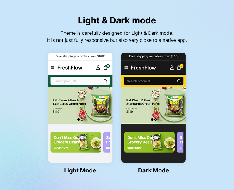 Freshflow’s nature-inspired design uses soft color schemes, clean layouts, and wholesome typography to give your store a fresh and healthy look. Every element is tailored to promote trust, clarity, and simplicity—key elements for food and wellness-based stores.