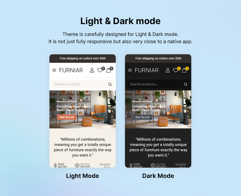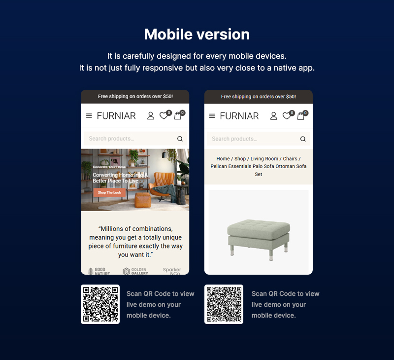 The design of Furniar is clean, sophisticated, and perfectly suited for showcasing furniture and home decor products. Its sleek layout, high-quality visuals, and intuitive navigation ensure an enjoyable browsing experience for your customers. Fully responsive and retina-ready, Furniar adapts seamlessly to any device or screen size, making your store accessible anywhere.
