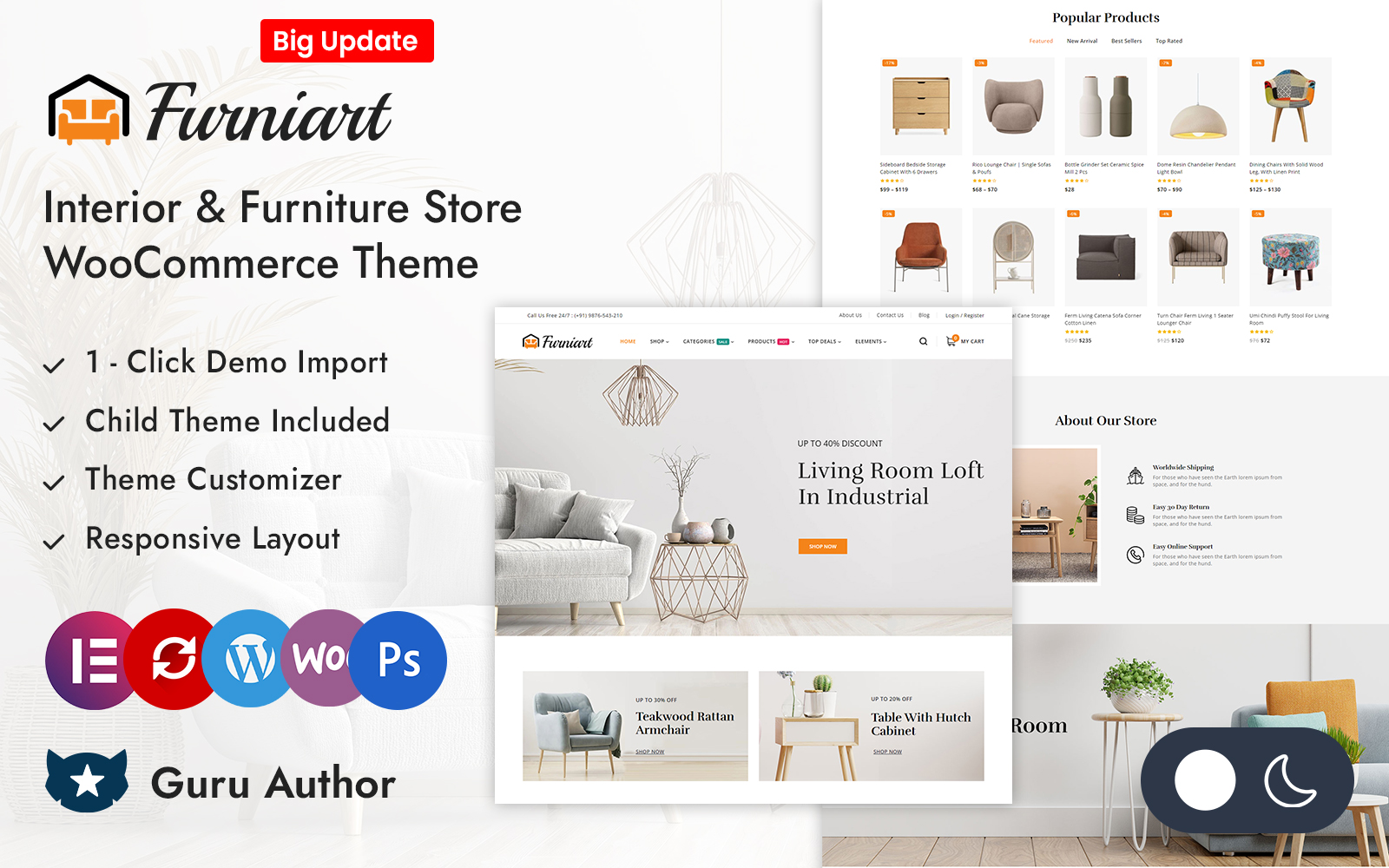 Ensure a seamless shopping experience for customers on mobile devices with Furniart's mobile-ready design. Stay ahead of the curve with Furniart's Dark Mode layout option. Simplify the setup process with Furniart's 1-Click Installation feature. Get your interior furniture store up and running quickly, allowing you to focus on curating and showcasing your exquisite collections without the hassle of complex setup procedures.