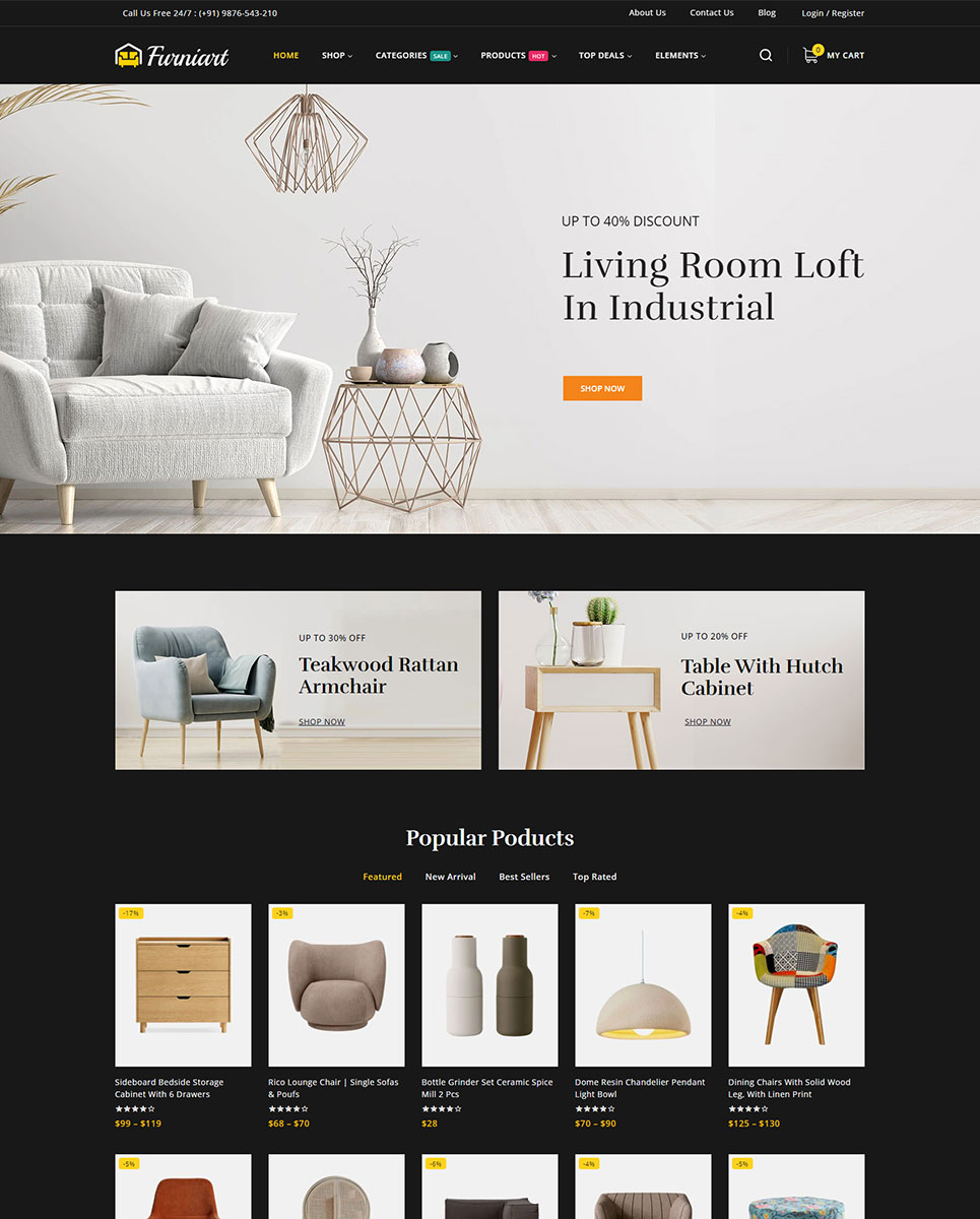 Furniart is a meticulously designed WordPress theme tailored specifically for interior furniture stores, home decoration, furniture catalogue, portfolio, seamlessly integrating Elementor and WooCommerce. With a focus on contemporary design and seamless functionality, Furniart provides a comprehensive platform to showcase and sell exquisite interior furniture pieces.
