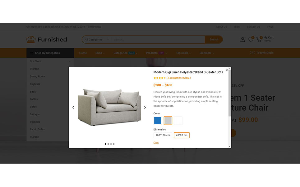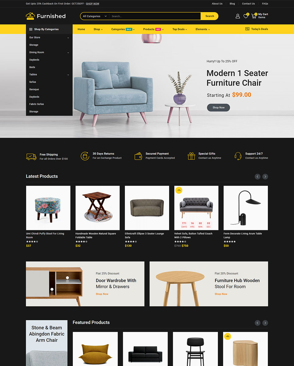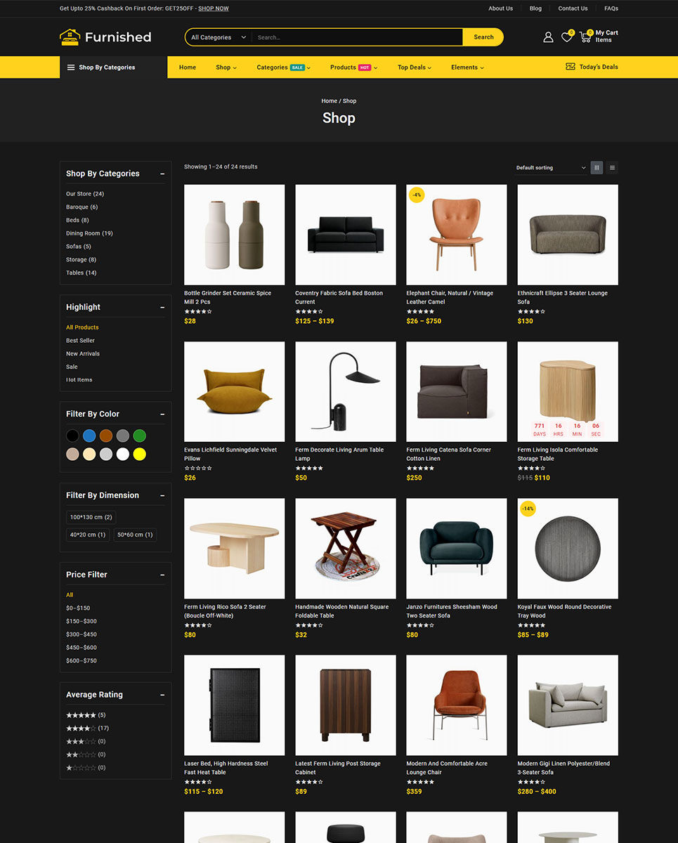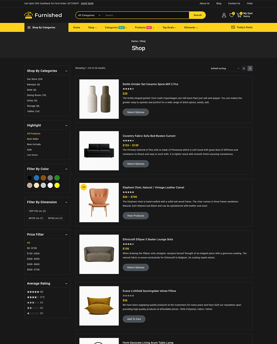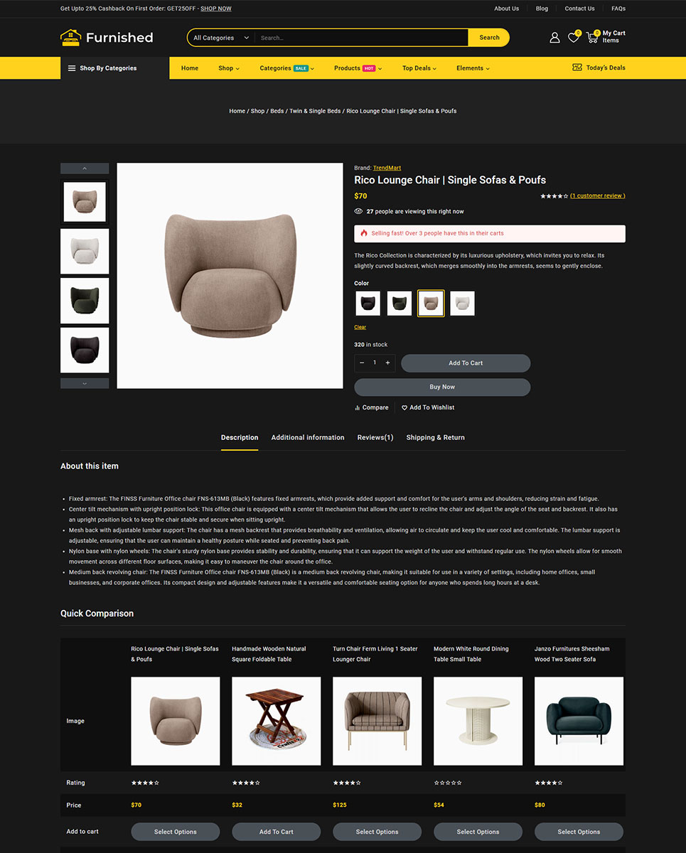 Customize your site effortlessly with the powerful Theme Customizer Settings, where you can fine-tune colors, typography, layouts, and more—all with real-time previews to ensure your brand identity is perfectly represented. For a modern touch, Furnished supports Dark Mode, giving your store a bold, contemporary appearance and a comfortable viewing experience, especially in dim environments.