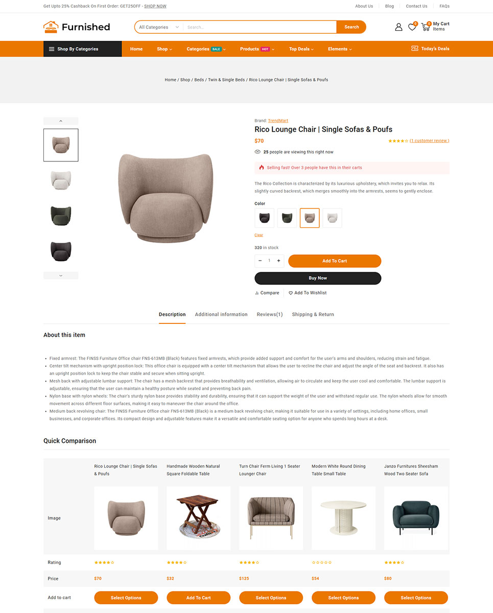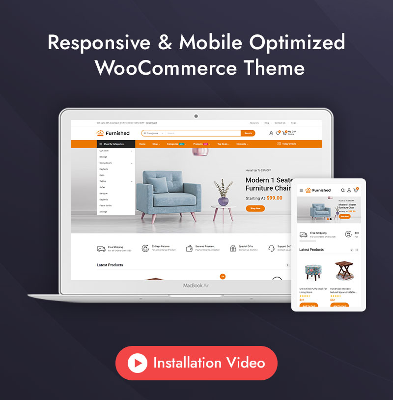 Furnished is a sleek, elegant, and modern WooCommerce theme crafted specifically for furniture stores, interior design shops, home décor outlets, and lifestyle product businesses. Designed with aesthetics and performance in mind, Furnished helps you build a beautiful and functional online store that captivates visitors and drives sales.