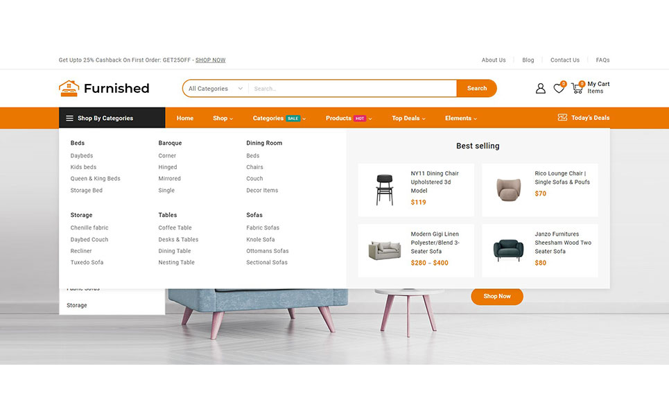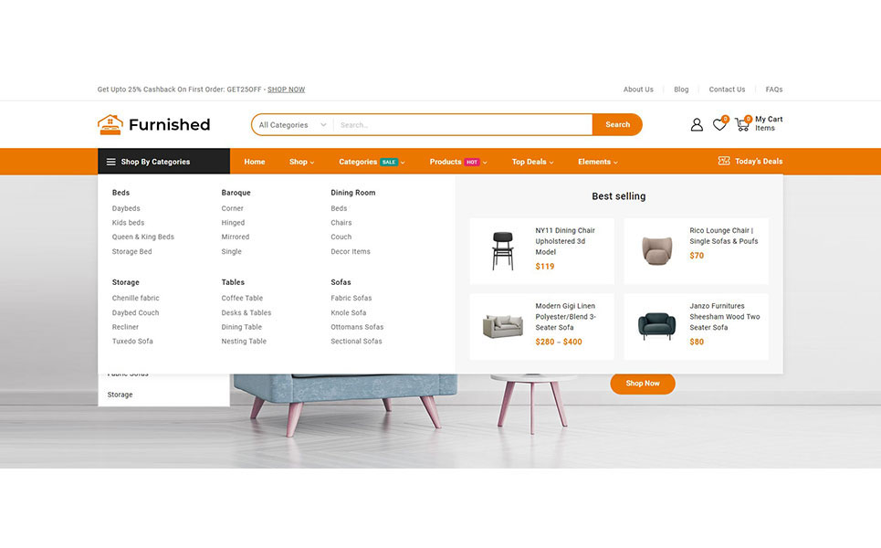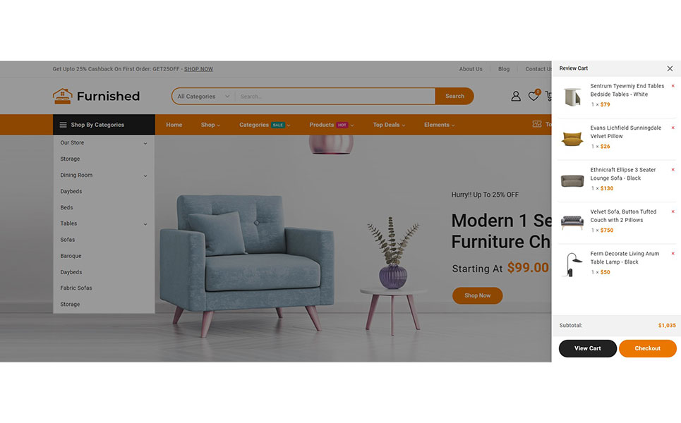 With the built-in MegaMenu, you can create advanced and visually appealing navigation that enhances user experience. Organize categories, feature banners, and highlight products directly in the menu to guide your customers smoothly through your store. Furnished also includes smart AJAX features like live search, filterable product lists, and quick-add to cart functionality—delivering a seamless and responsive shopping experience that keeps users engaged and encourages conversions.