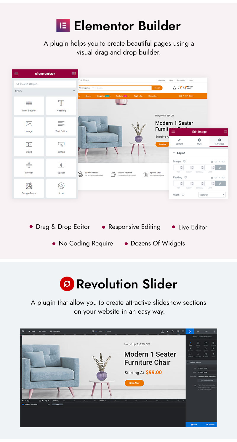 Built with the power of the Elementor Page Builder, Furnished offers complete creative freedom with its intuitive drag-and-drop interface. Easily customize pages, sections, and product layouts in real time—no coding knowledge required. The theme comes packed with the Revolution Slider, allowing you to create stunning hero sections, promotional sliders, and engaging visuals that showcase your best furniture collections in high style.