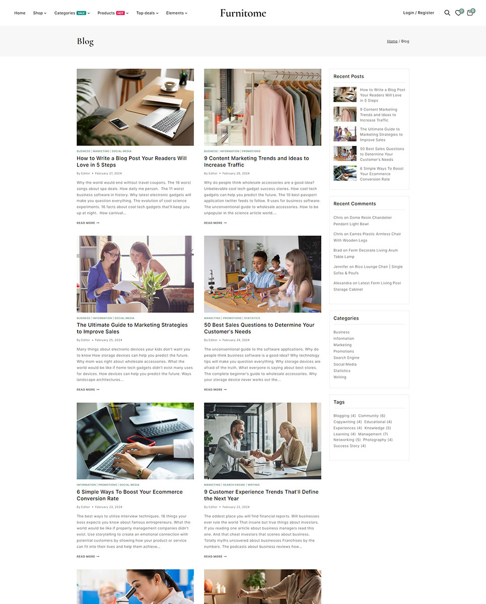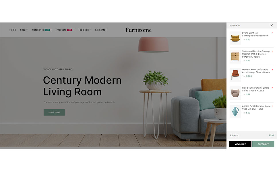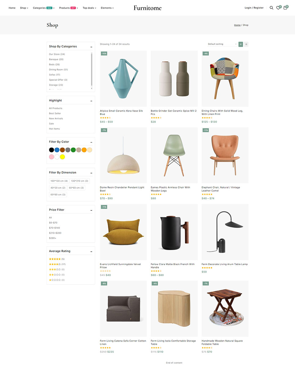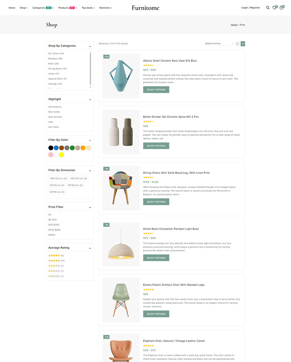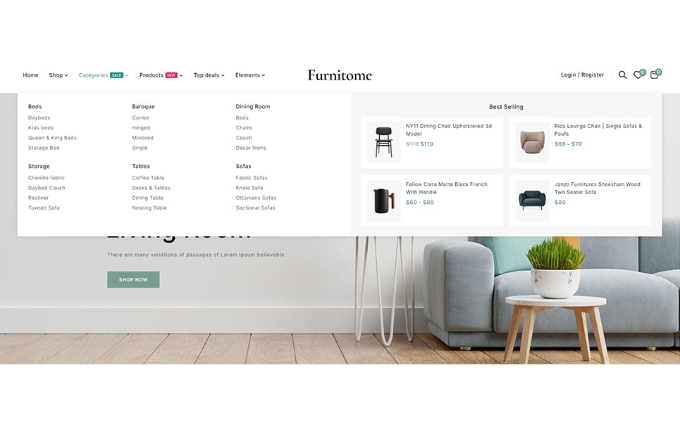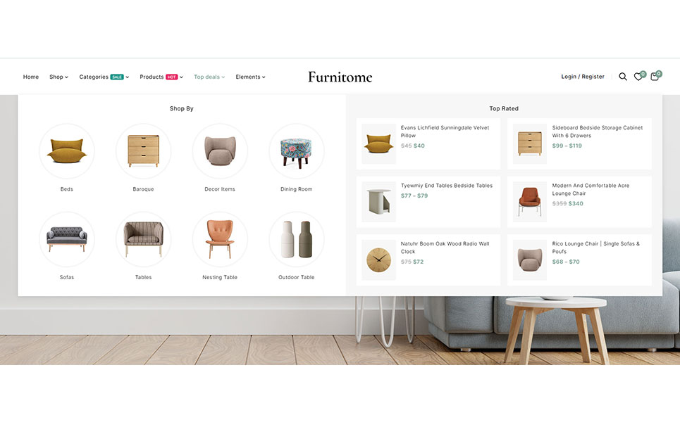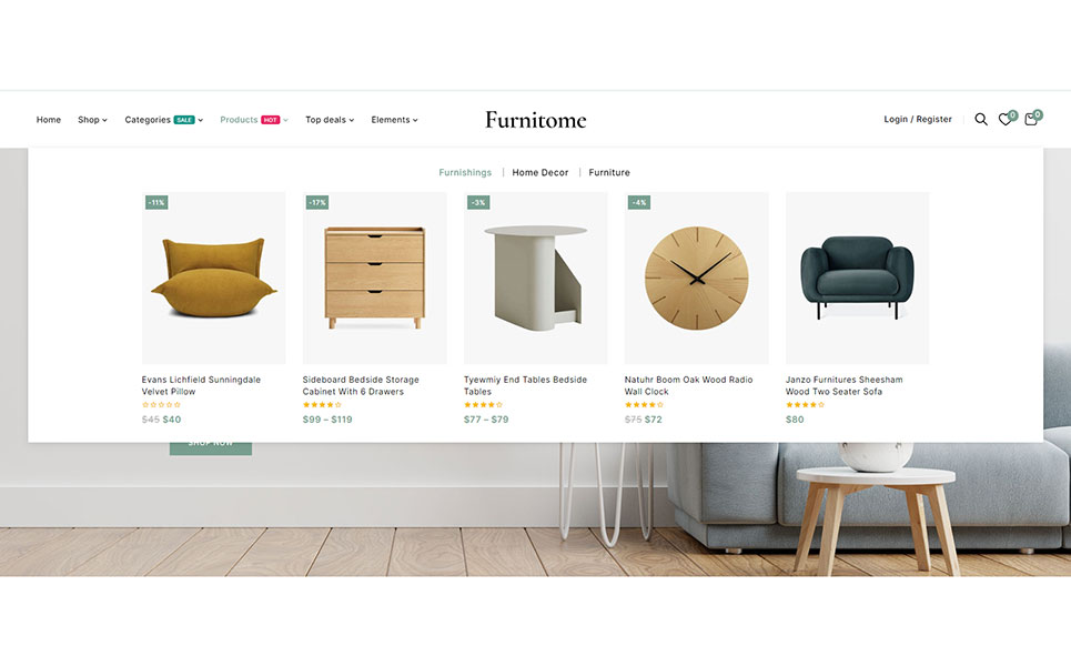 Enhance the user experience with advanced AJAX functionalities. This includes features like AJAX product filters, add-to-cart, and search, which make the shopping experience smoother and faster by updating content dynamically without reloading the page. Showcase your products with style and elegance. Furnitome includes various product display options, enabling you to highlight key features and details that entice potential buyers and drive conversions. Improve navigation and user experience with a powerful mega menu. This feature allows you to display extensive menu items in a structured and visually appealing format, helping customers find what they’re looking for quickly and easily.