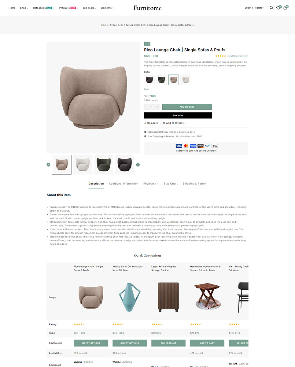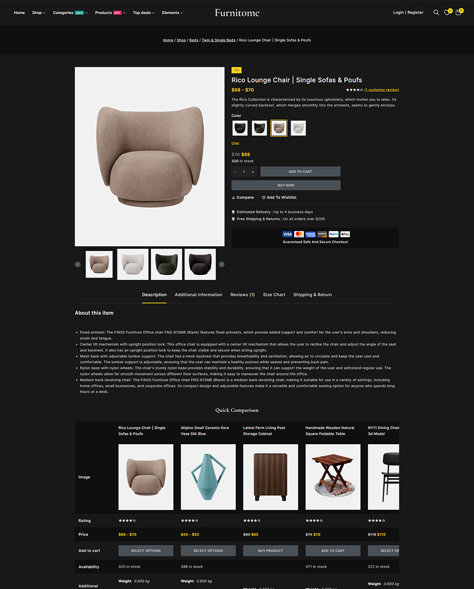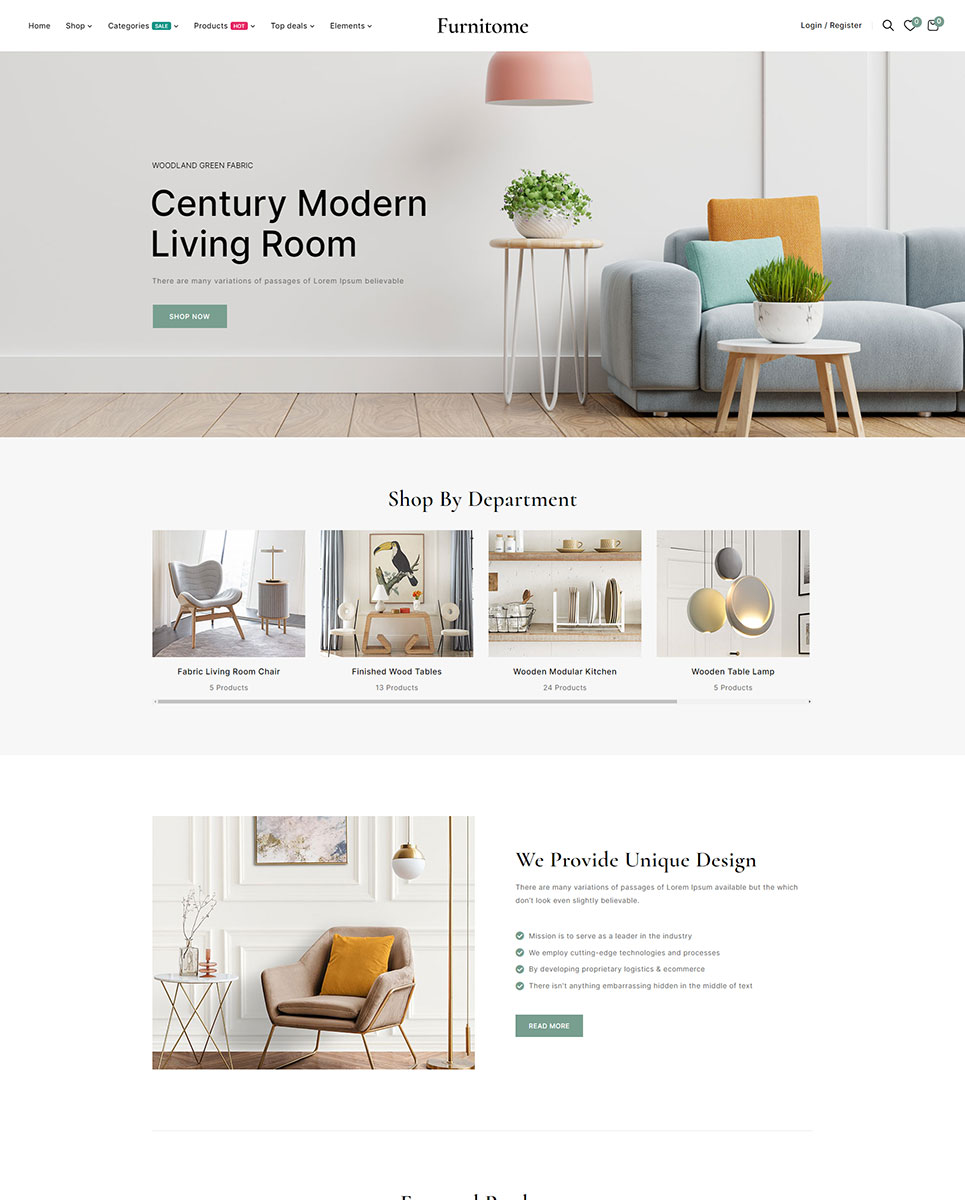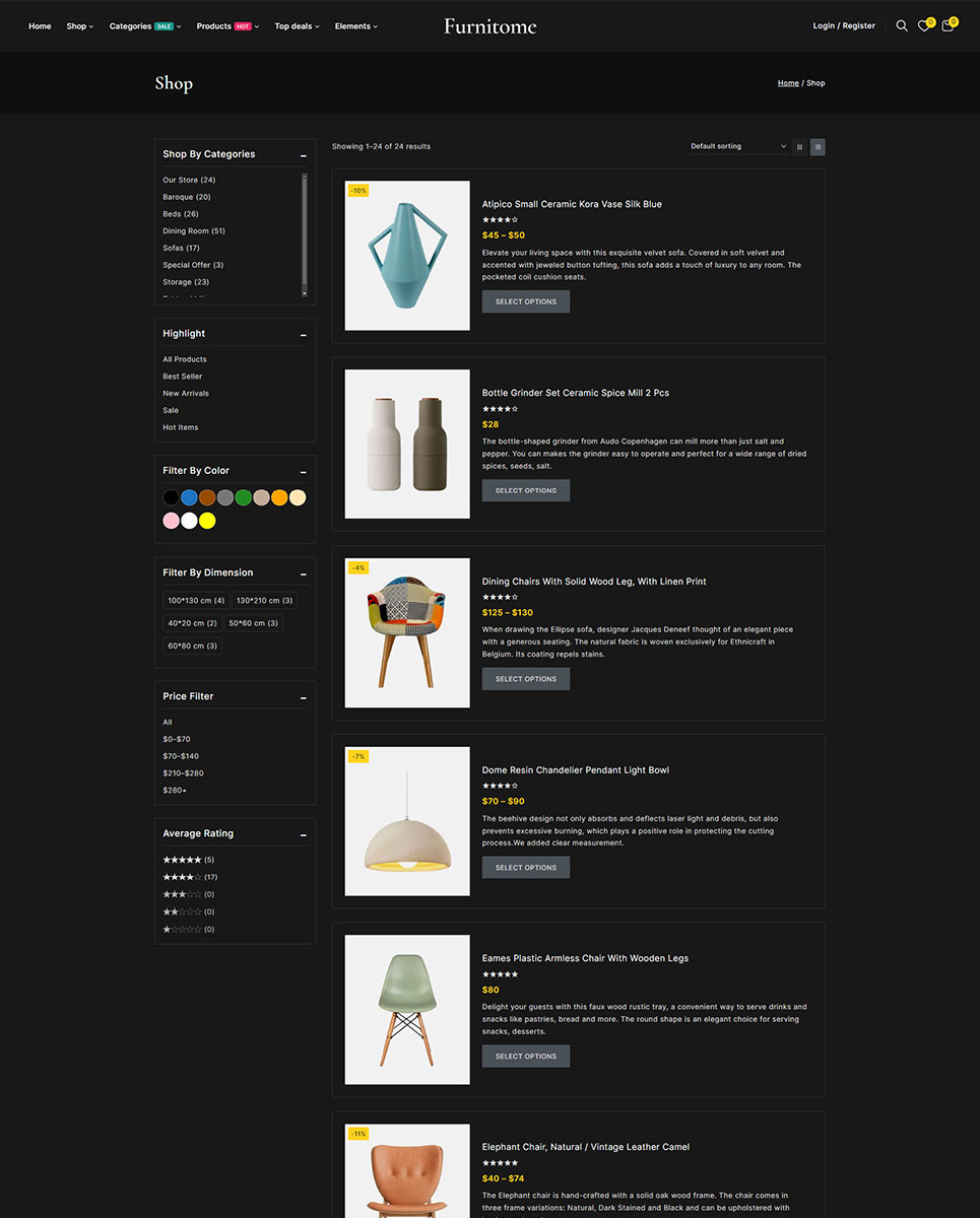 Furnitome is a modern Woo-Commerce theme packed with advanced features for creating an online store for Furniture, Interior and Home Decore items. Furnitome is crafted to deliver an unparalleled e-commerce experience, blending aesthetics with robust functionality. Designed with meticulous attention to detail, this theme offers a suite of features that empower you to build a stunning and efficient online store effortlessly. The clean and elegant layout is perfect for showcasing home decor and interior design products, providing a visually appealing and intuitive shopping experience for your customers.