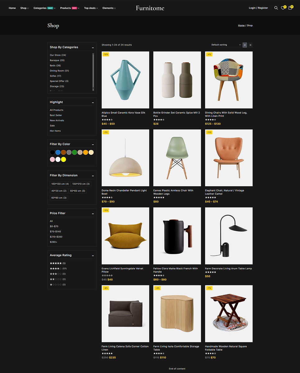 Personalize every aspect of your website with a robust theme customizer. Adjust colors, fonts, layouts, and more in real-time, ensuring your site aligns perfectly with your brand identity. Tailor your headers and footers to match your branding and meet your specific needs. Furnitome’s header and footer customizer provides the flexibility to create unique and functional sections that enhance navigation and user engagement. Offer a modern and stylish browsing experience with a dark mode option. This feature not only reduces eye strain for your visitors but also gives your site a sleek and contemporary look.