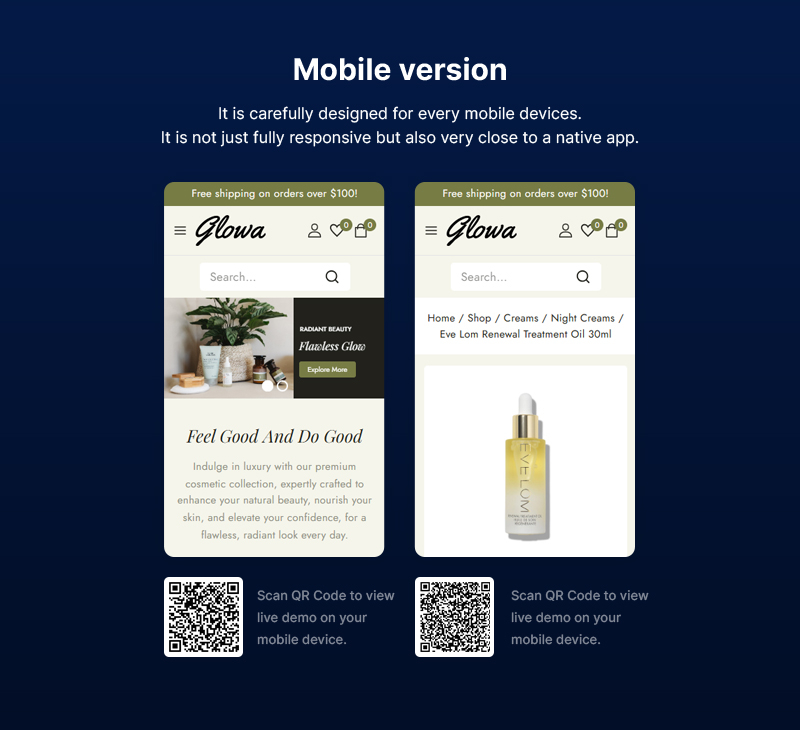Glowa combines soft, modern aesthetics with robust eCommerce features to boost your sales and engage your visitors. Its clean layouts, refined typography, and immersive product displays create a luxurious atmosphere that perfectly matches beauty and wellness brands. Fully responsive and retina-ready, your store will look equally impressive on smartphones, tablets, and desktops.