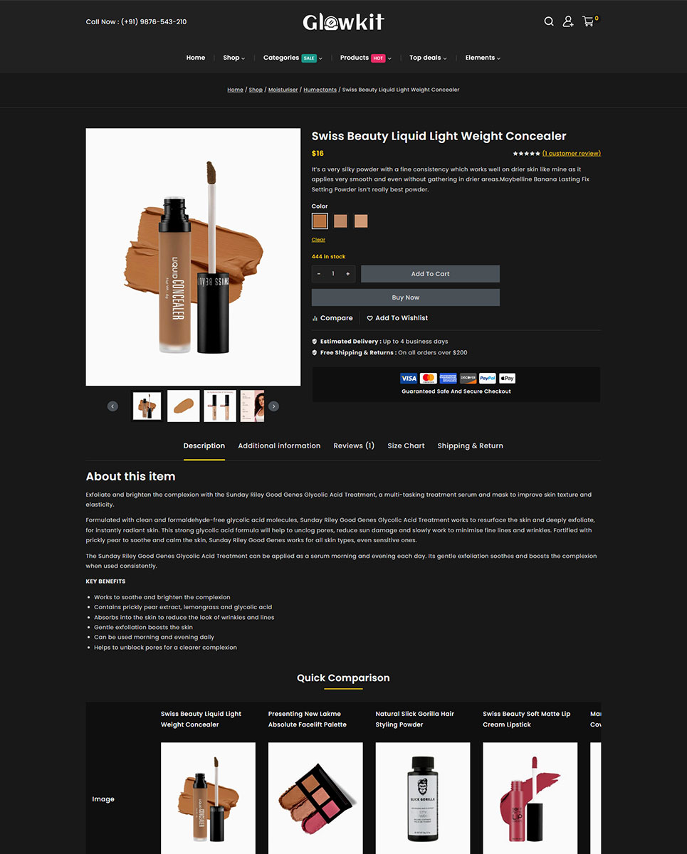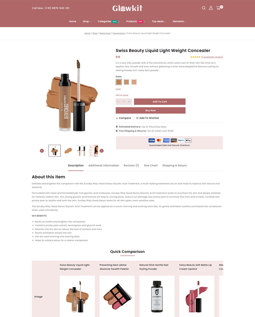 Glowkit is designed with a mobile-first approach, ensuring that your site looks and functions flawlessly across all devices and screen sizes. With built-in SEO optimization features, Glowkit helps improve your website's visibility and ranking in search engine results. With Glowkit's one-click installation feature, setting up your beauty and cosmetic store is a breeze. Simply install the theme with a single click, import demo content, and start customizing to suit your brand's identity and preferences.