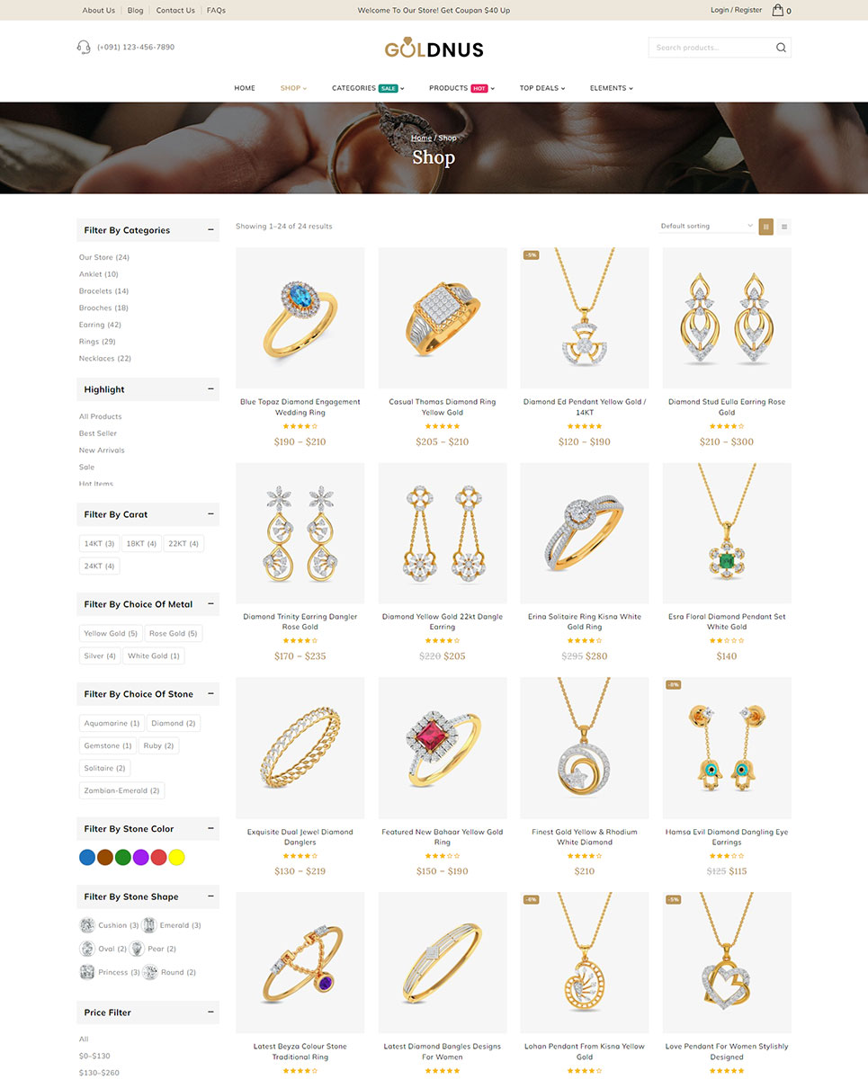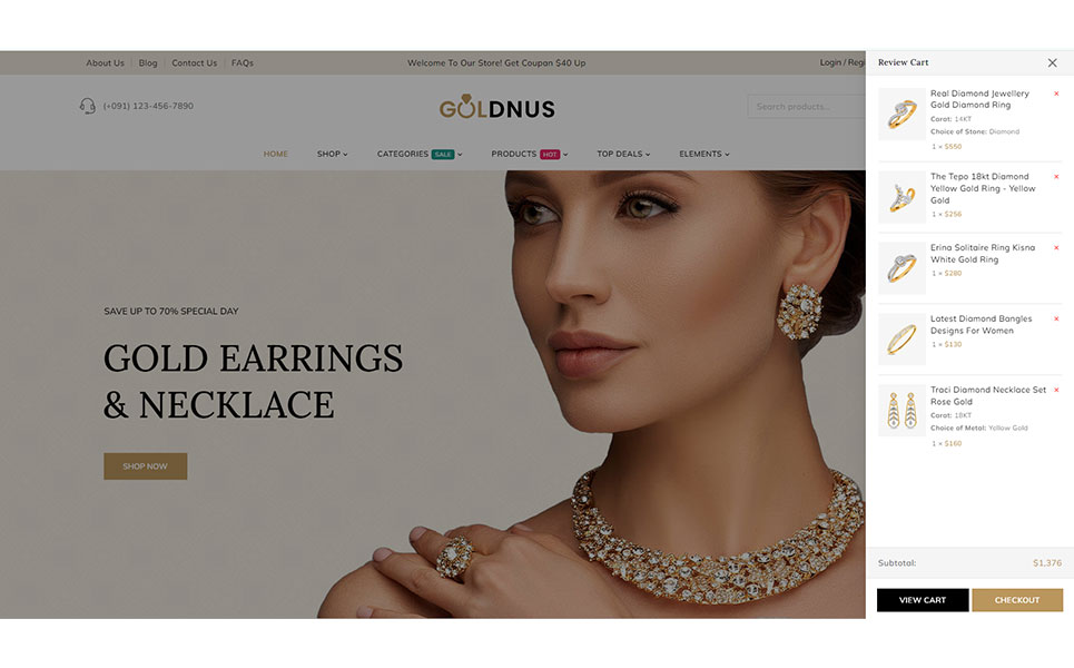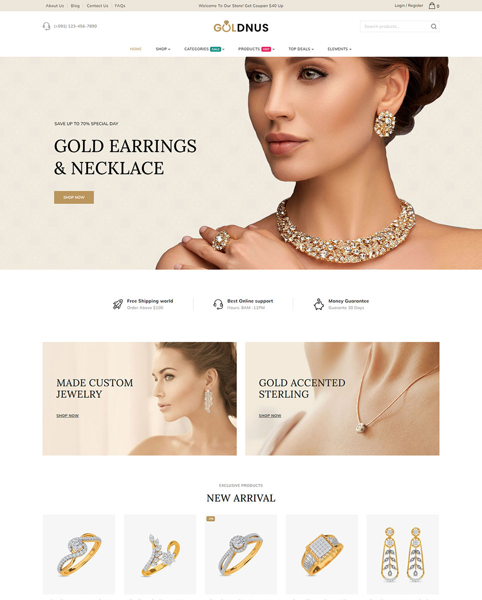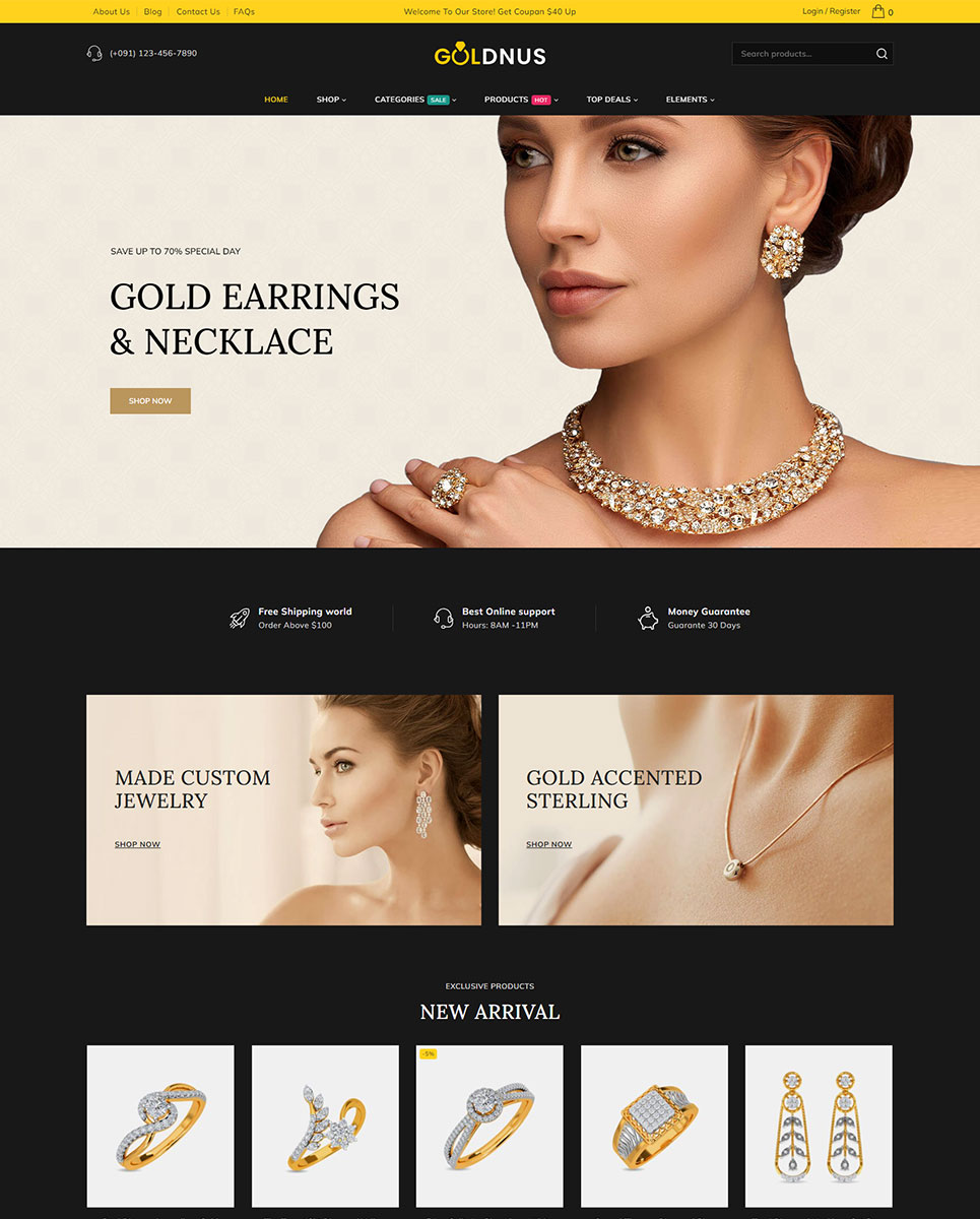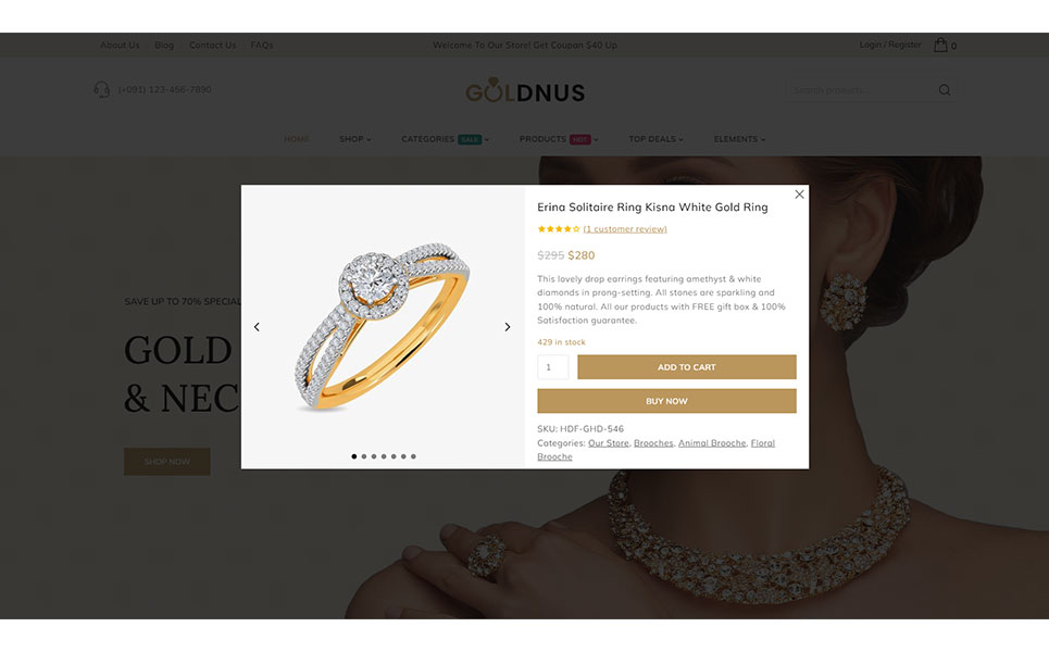 Goldnus is a sophisticated and elegant Jewelry Store Elementor WooCommerce Responsive Theme designed to elevate your online jewelry business to new heights. Packed with a plethora of features and functionalities, it offers a seamless user experience for customer. This responsive theme is high quality fully customizable multipurpose wordpress theme design for diversified topics like Jewelry, Diamond, Gold, Accessories, Cosmetic, Beauty, Apparel, Fashion and many more.