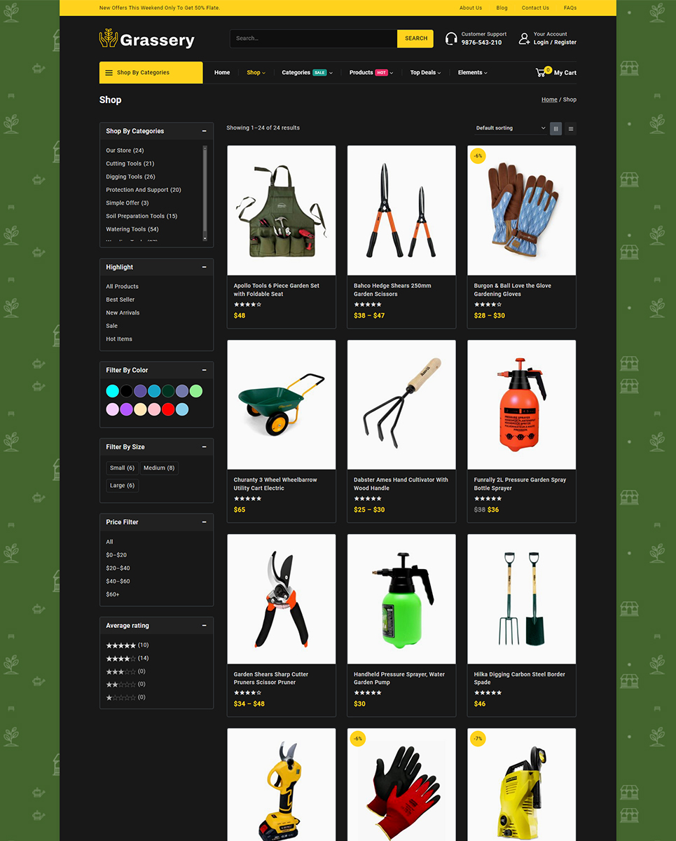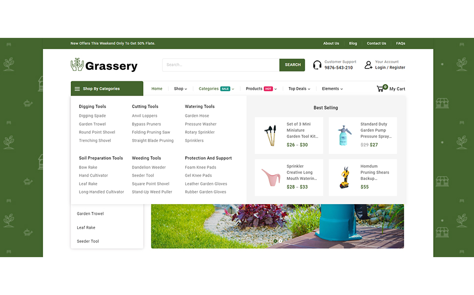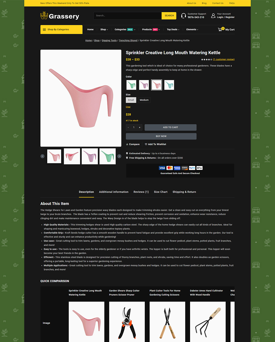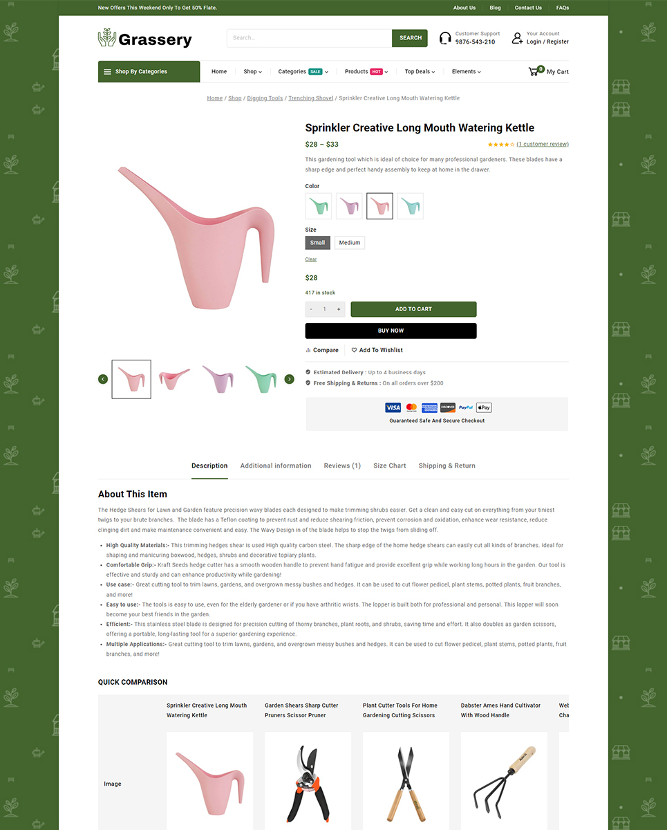 Welcome to Grassery, the premier destination for all your gardening tool needs, crafted with the sophisticated Elementor WooCommerce Responsive Theme. Our store is meticulously designed with a box layout that ensures a clean and organized browsing experience, making it easier for you to find and purchase the tools you need to cultivate your perfect garden.