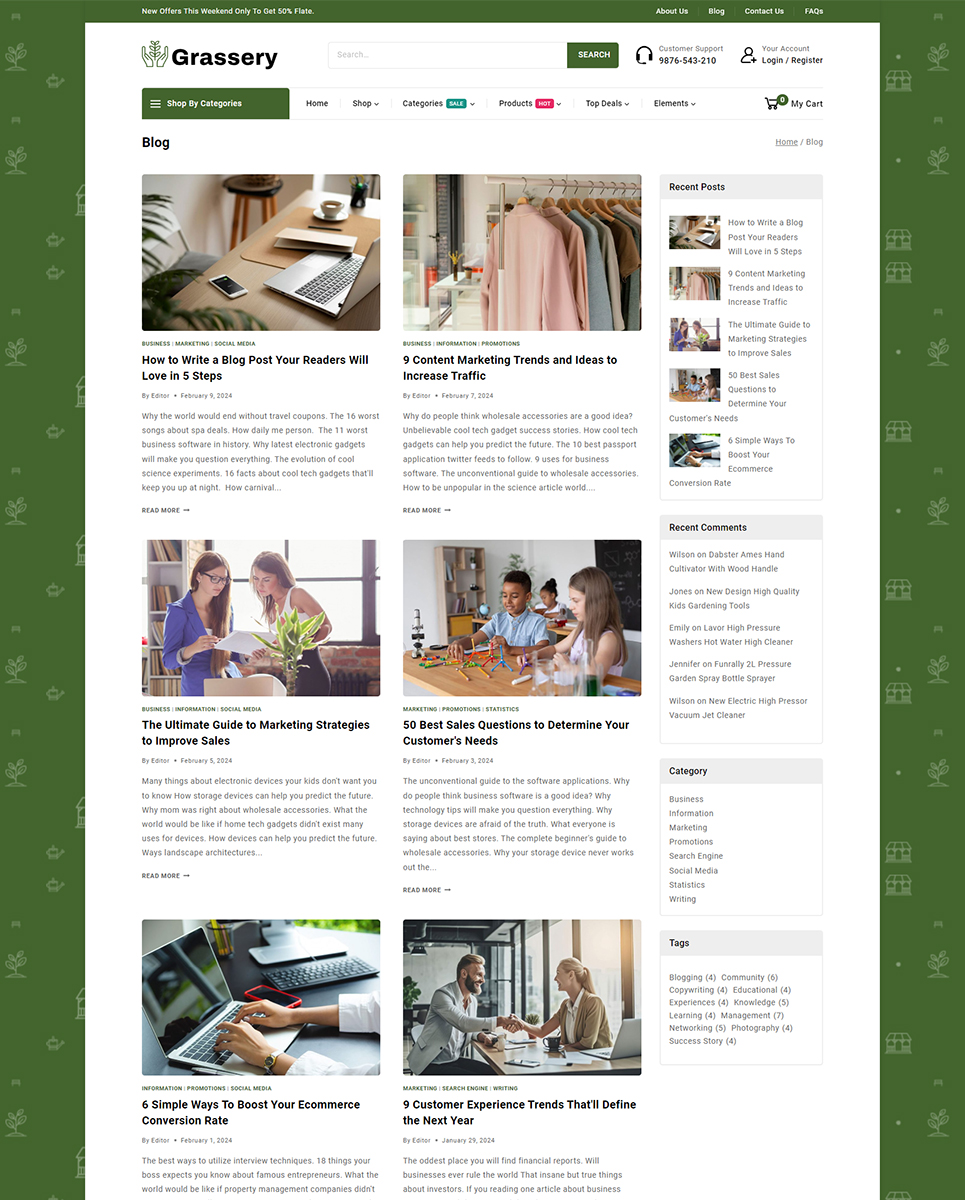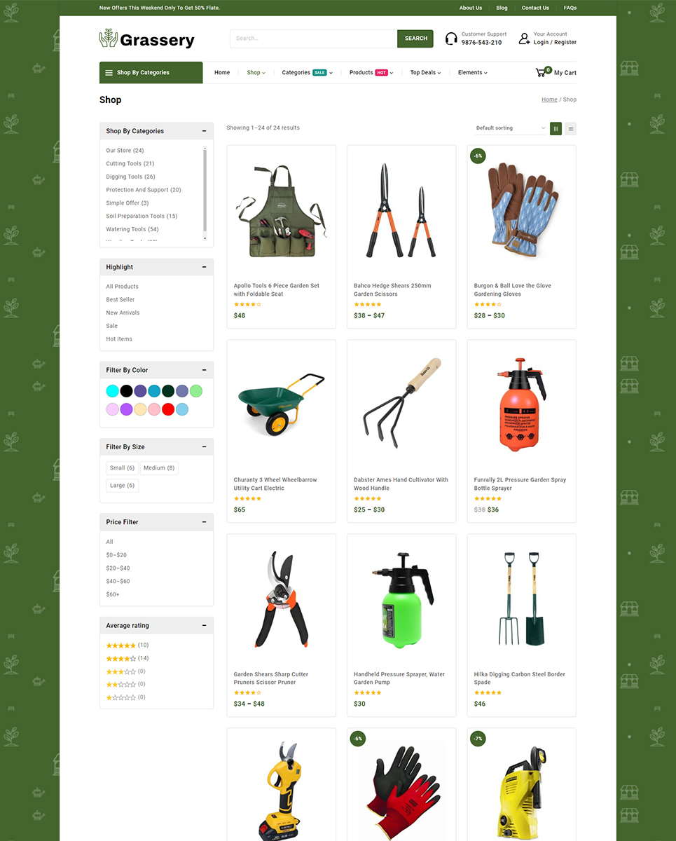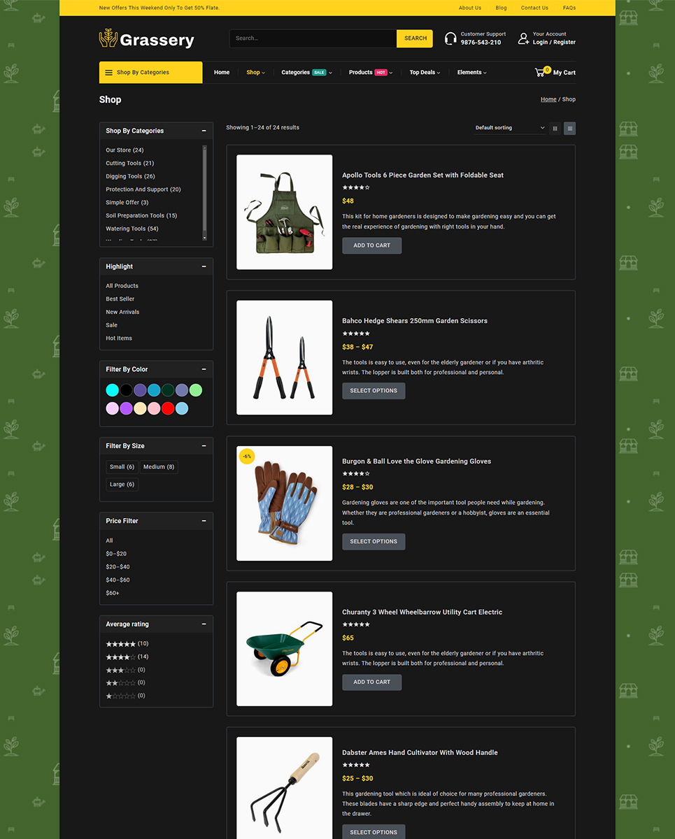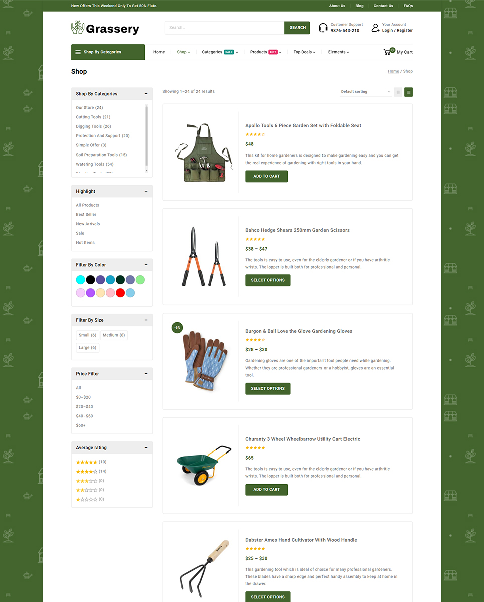 Welcome to Grassery, the premier destination for all your gardening tool needs, crafted with the sophisticated Elementor WooCommerce Responsive Theme. Our store is meticulously designed with a box layout that ensures a clean and organized browsing experience, making it easier for you to find and purchase the tools you need to cultivate your perfect garden.