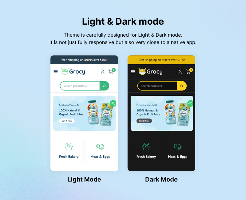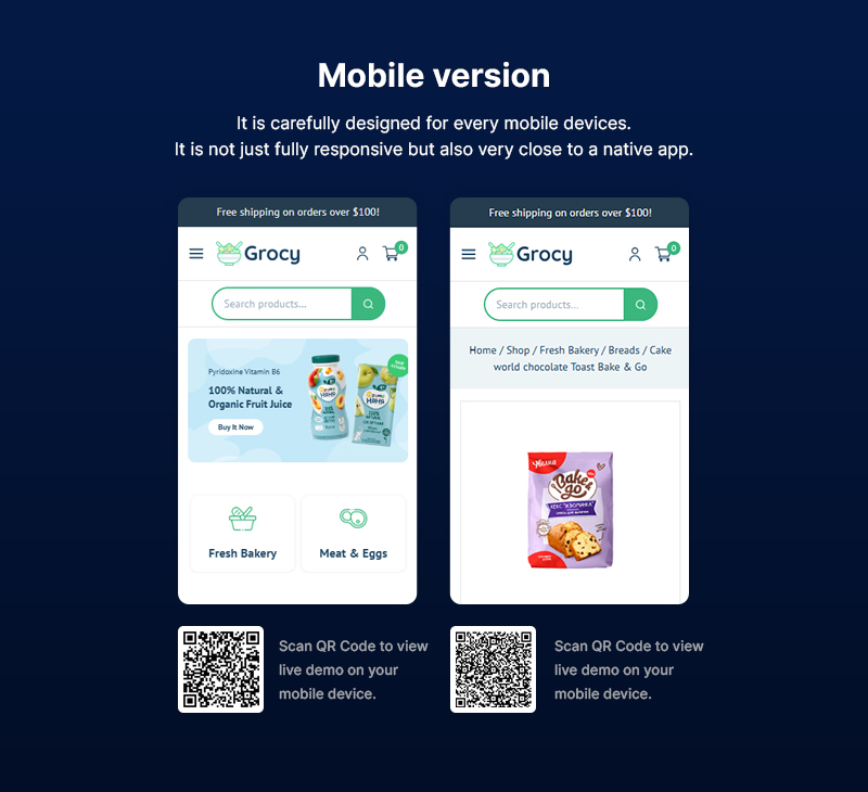Grocy’s clean, modern design is tailored for product-rich stores. With a spacious layout and smart product grids, your items are always the center of attention. The homepage includes a customizable hero section, promotional banners, and product carousels — giving you full creative control without any coding skills required.