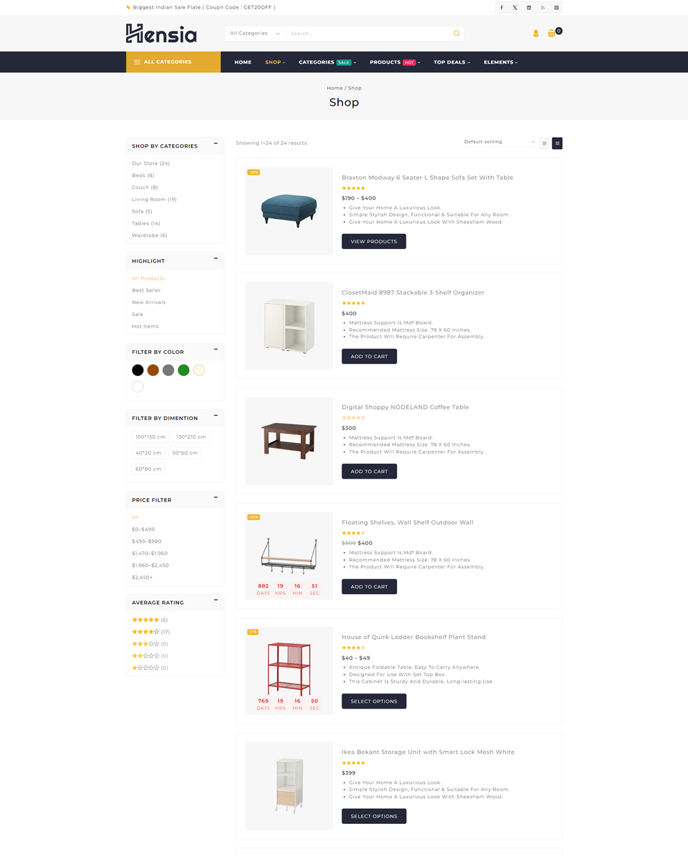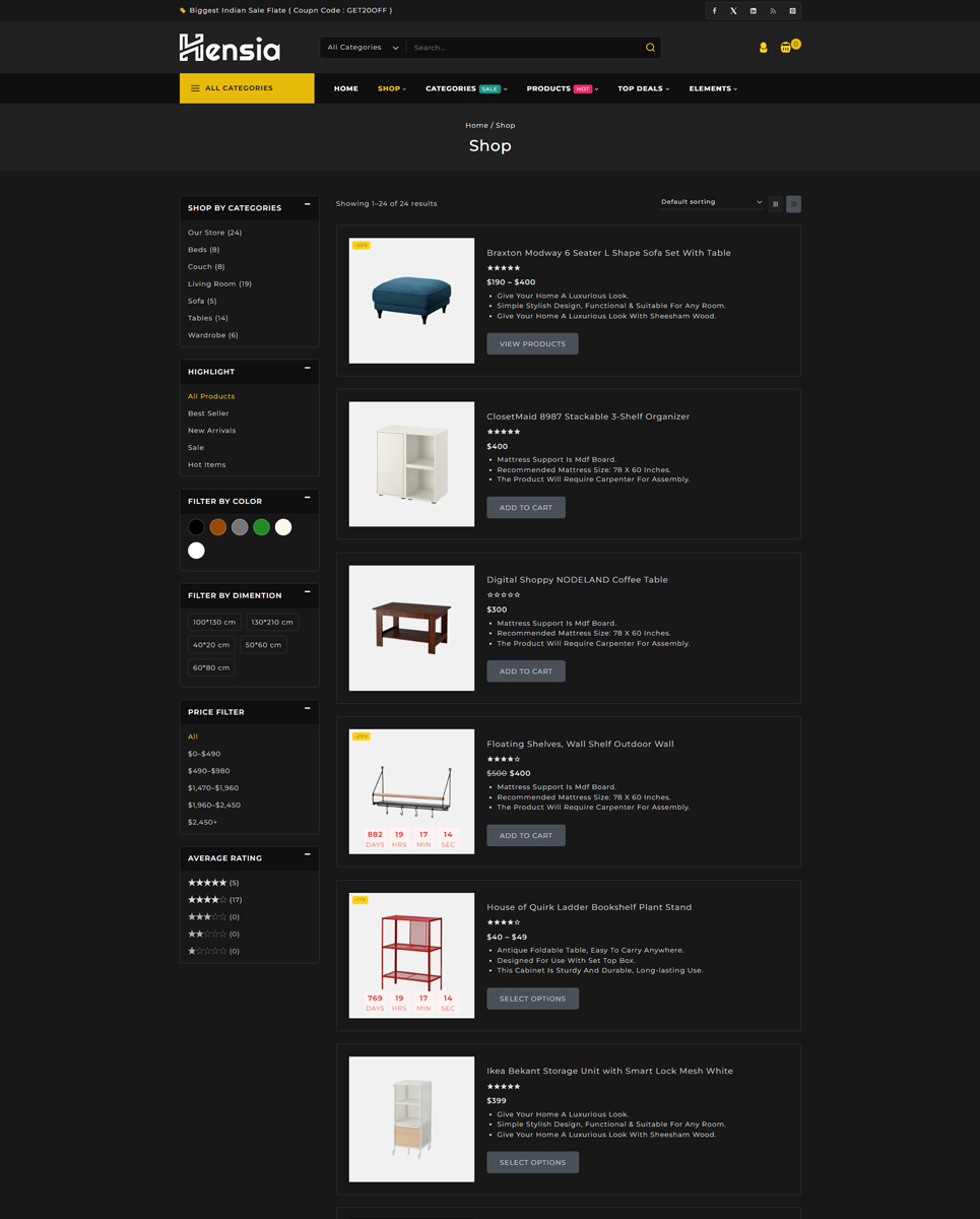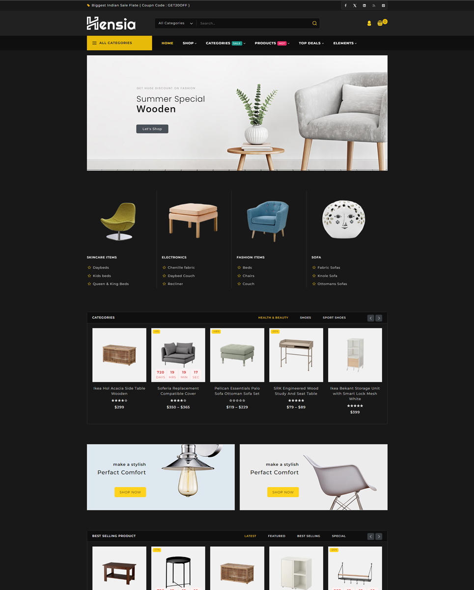 Hensia is a beautifully crafted WooCommerce theme designed specifically for furniture stores, home decor boutiques, and interior design shops. It combines modern aesthetics with powerful eCommerce functionality, making it the perfect solution for businesses looking to showcase their products in a stylish, user-friendly way.