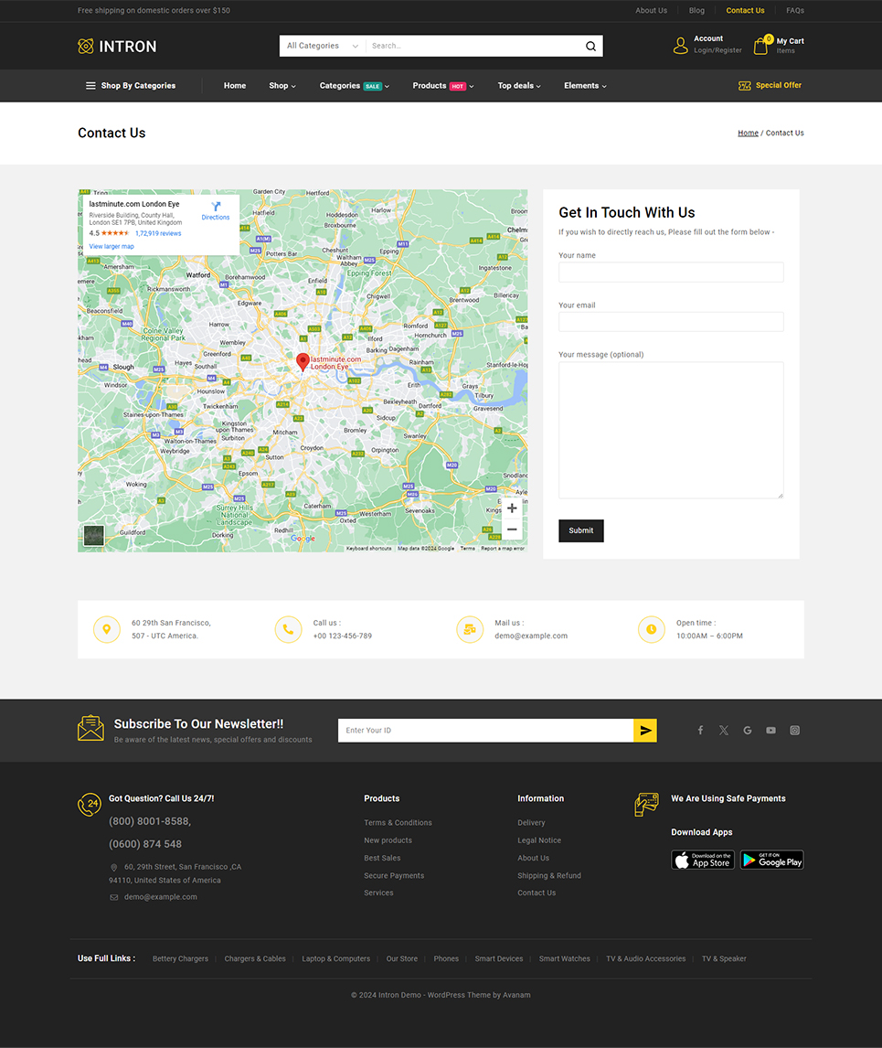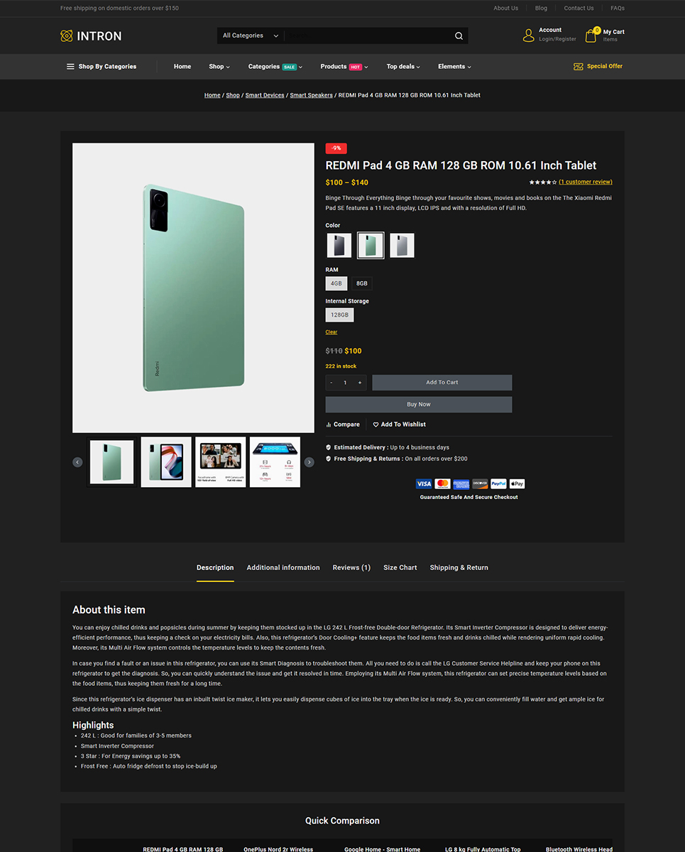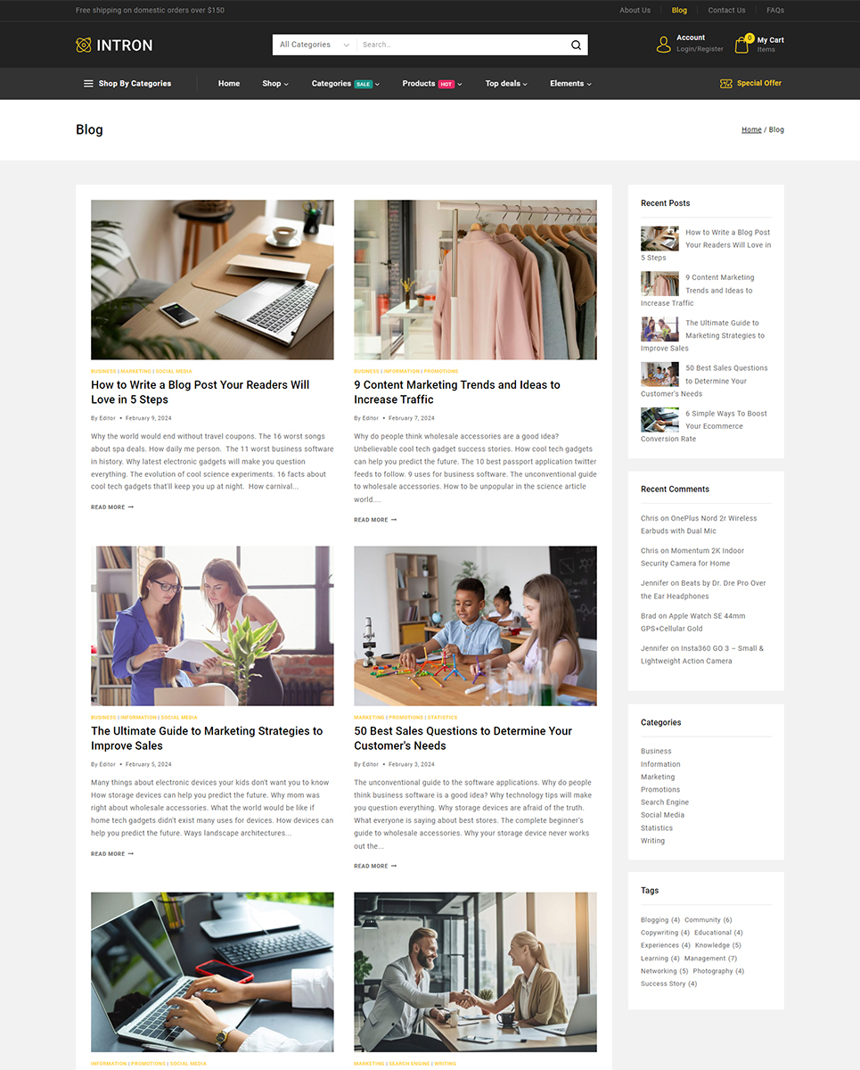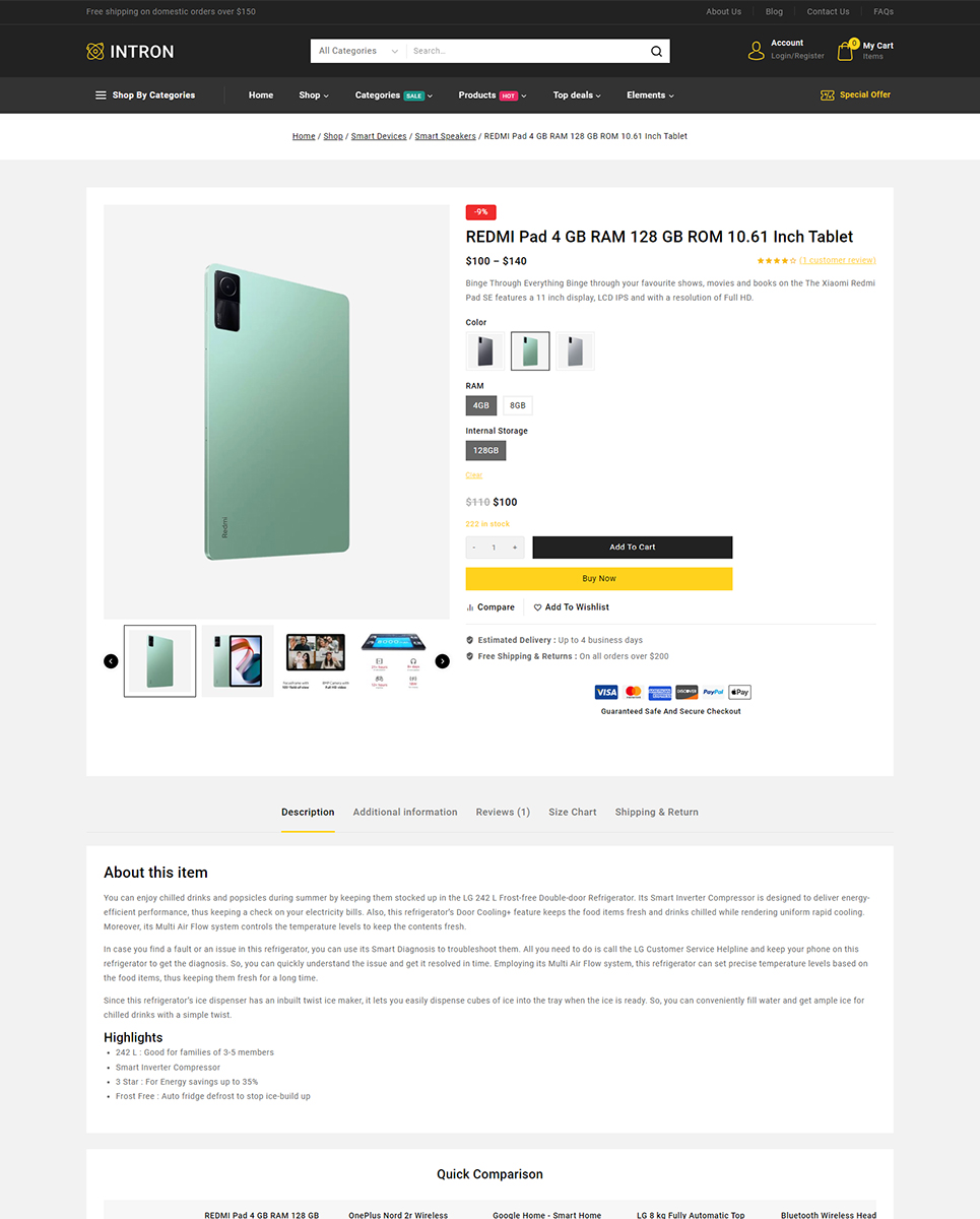 The theme is built with a responsive design, ensuring that the website adapts seamlessly to various screen sizes and devices, including smartphones, tablets, and desktops. Intron is optimized for search engines, ensuring better visibility and ranking on search engine results pages (SERPs). The theme offers 1-click installation functionality, allowing users to quickly and easily set up their online store without the need for complex setup processes.