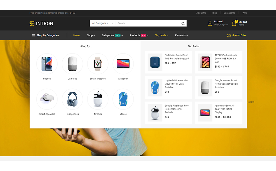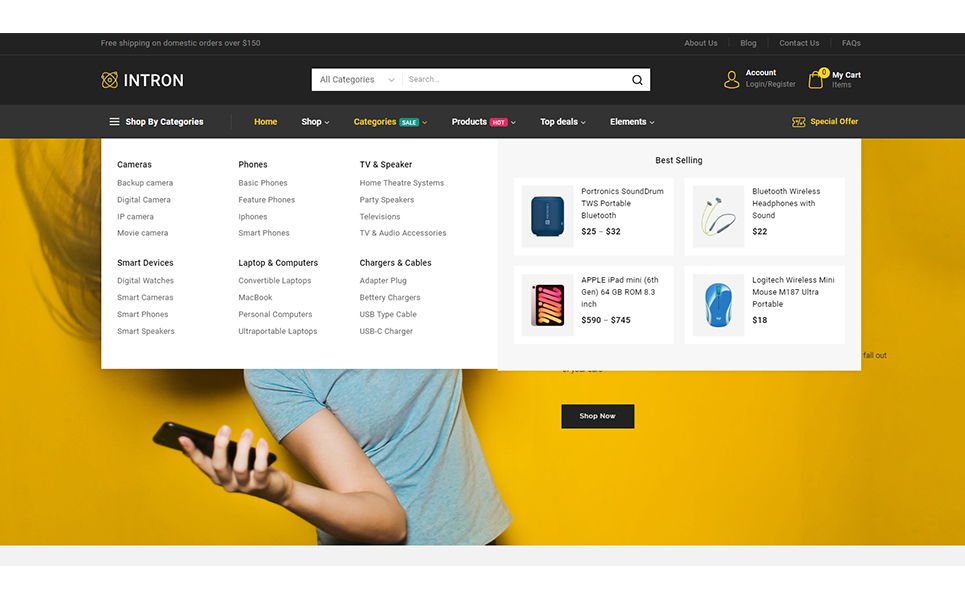 The theme includes a dedicated "Shop by Category" section, enabling users to organize products into different categories for easy browsing. Intron features a mega menu functionality, allowing users to create expansive navigation menus with multiple columns, categories, and subcategories. This enhances the website's usability and facilitates easy navigation for customers, enabling them to find products quickly and efficiently. Intron offers an advanced search feature that allows customers to quickly find products by entering keywords or specific criteria. This helps improve the shopping experience by reducing the time.