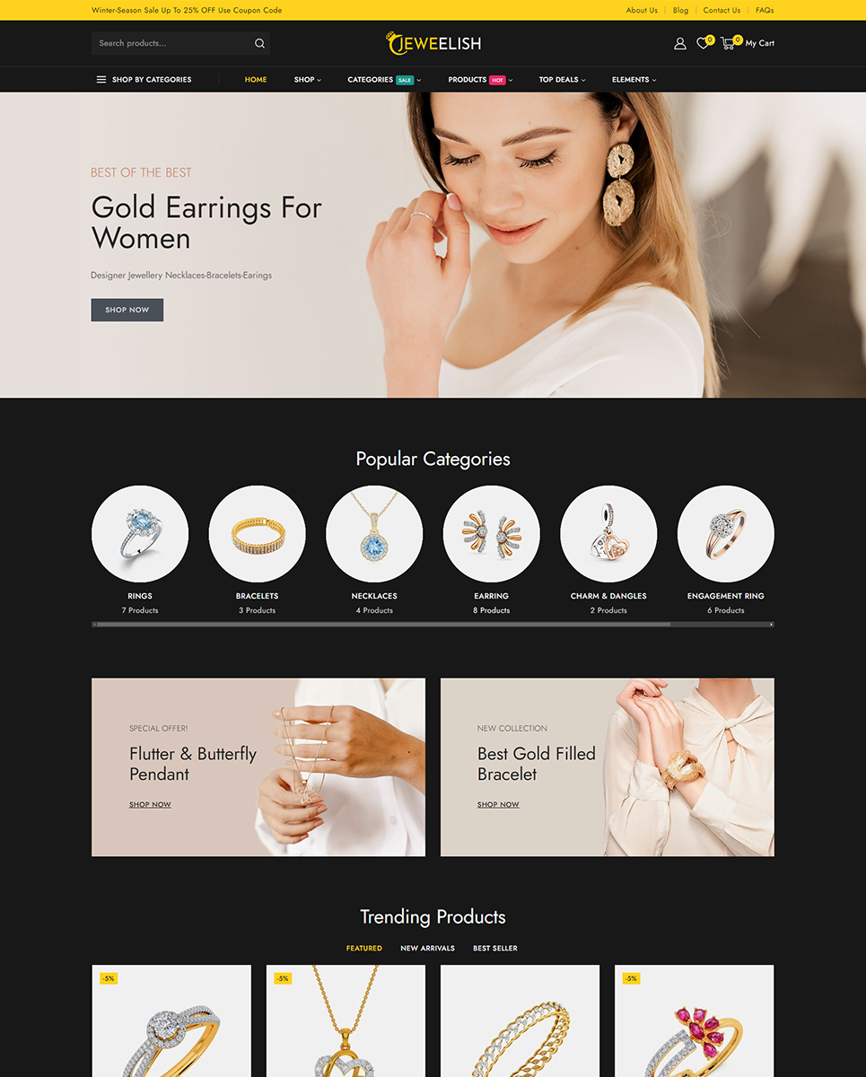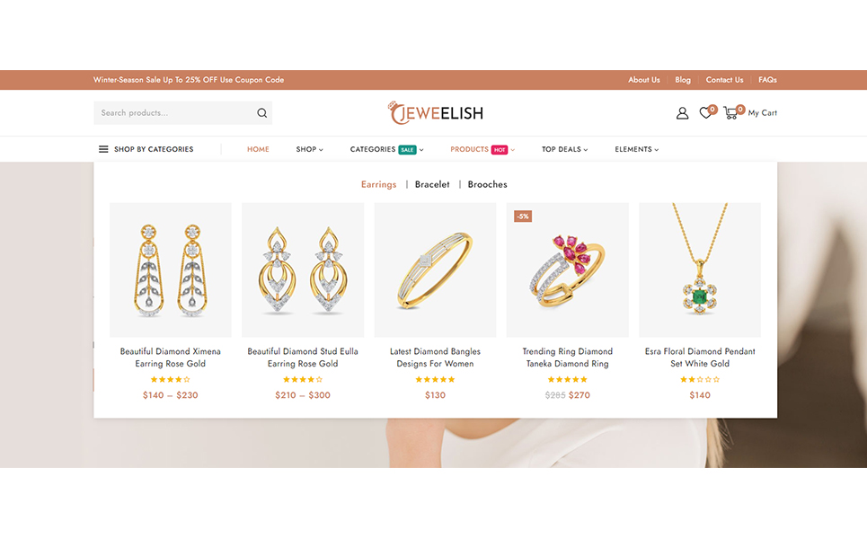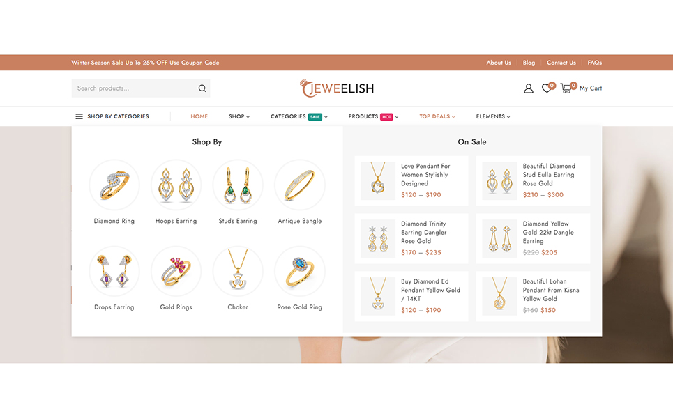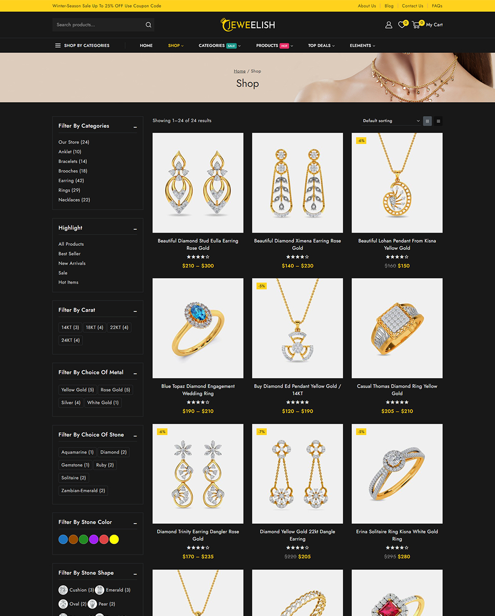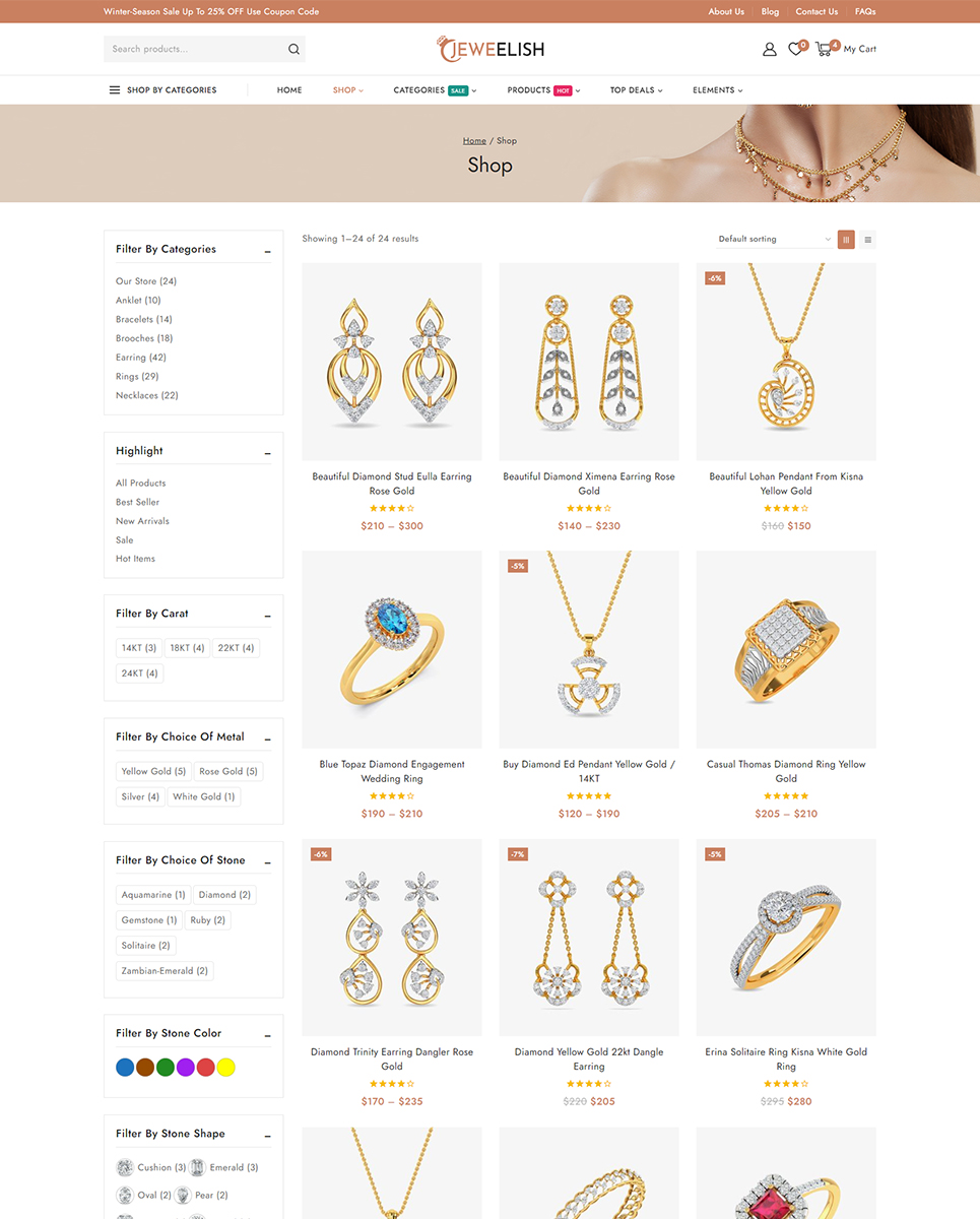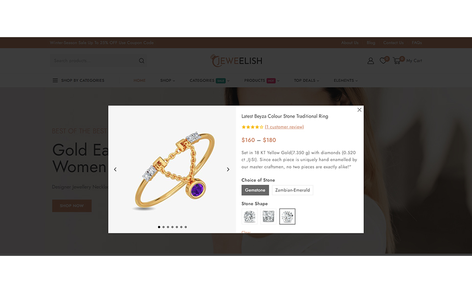 Do you want to develop your own website to market your manufactured products online? Then, Jeweelish is the perfect solution for you. Jeweelish, the ultimate online destination for exquisite jewelry and dazzling diamonds, beautifully crafted with the Elementor WooCommerce Responsive Theme. It specially designed to provide a luxurious and seamless shopping experience, Jeweelish combines elegance with advanced functionality, ensuring that every visit is memorable and delightful.