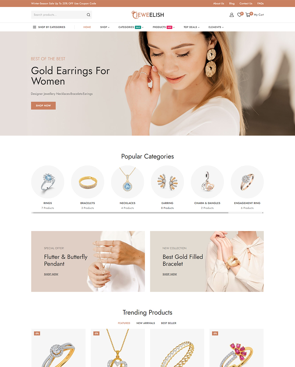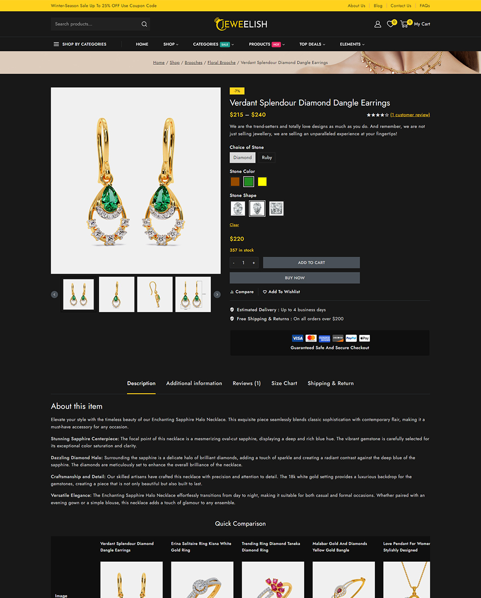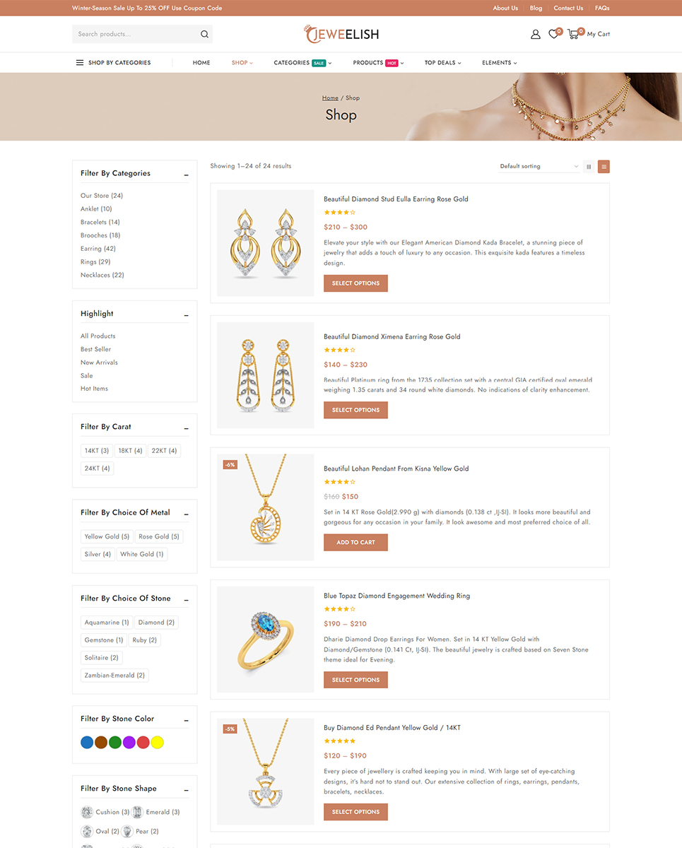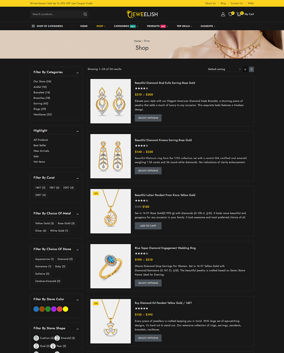 Do you want to develop your own website to market your manufactured products online? Then, Jeweelish is the perfect solution for you. Jeweelish, the ultimate online destination for exquisite jewelry and dazzling diamonds, beautifully crafted with the Elementor WooCommerce Responsive Theme. It specially designed to provide a luxurious and seamless shopping experience, Jeweelish combines elegance with advanced functionality, ensuring that every visit is memorable and delightful.