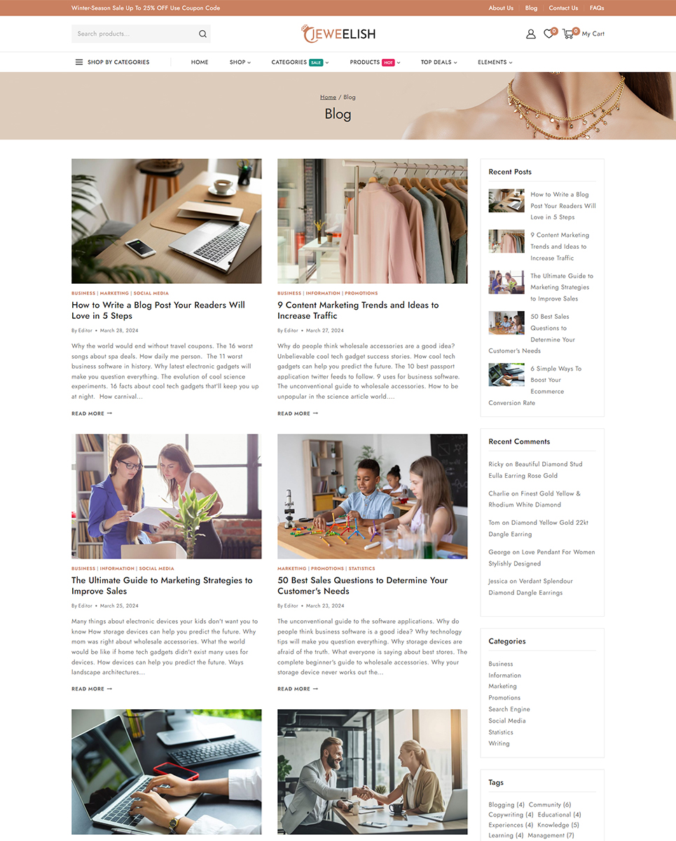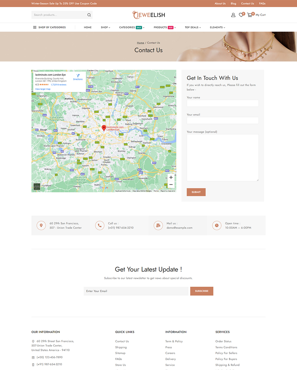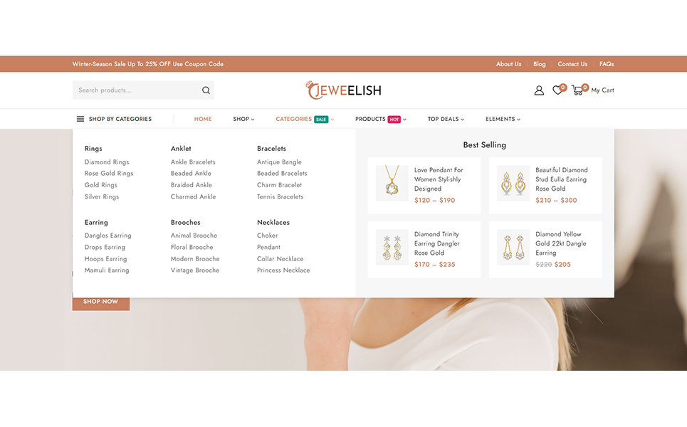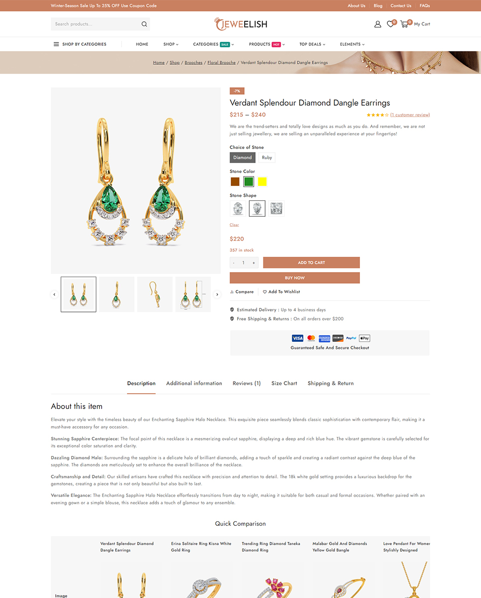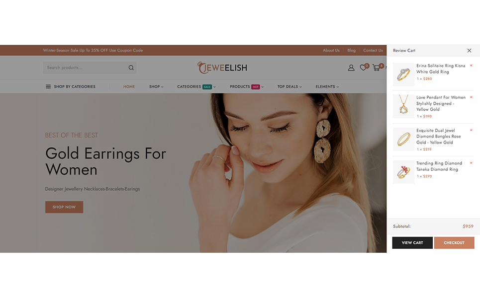 Do you want to develop your own website to market your manufactured products online? Then, Jeweelish is the perfect solution for you. Jeweelish, the ultimate online destination for exquisite jewelry and dazzling diamonds, beautifully crafted with the Elementor WooCommerce Responsive Theme. It specially designed to provide a luxurious and seamless shopping experience, Jeweelish combines elegance with advanced functionality, ensuring that every visit is memorable and delightful.