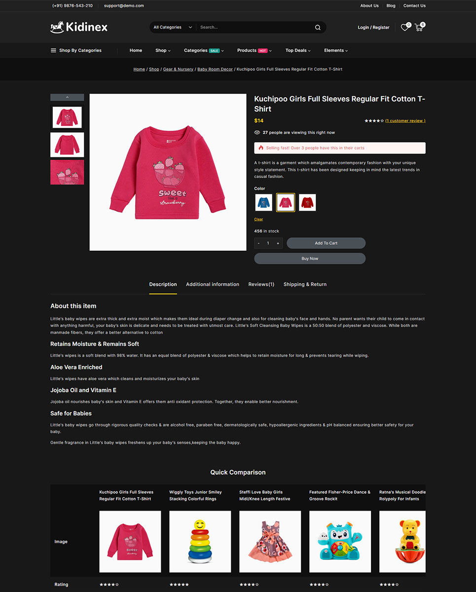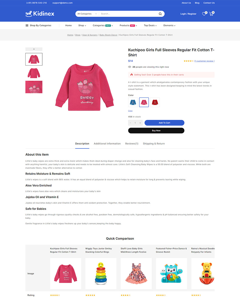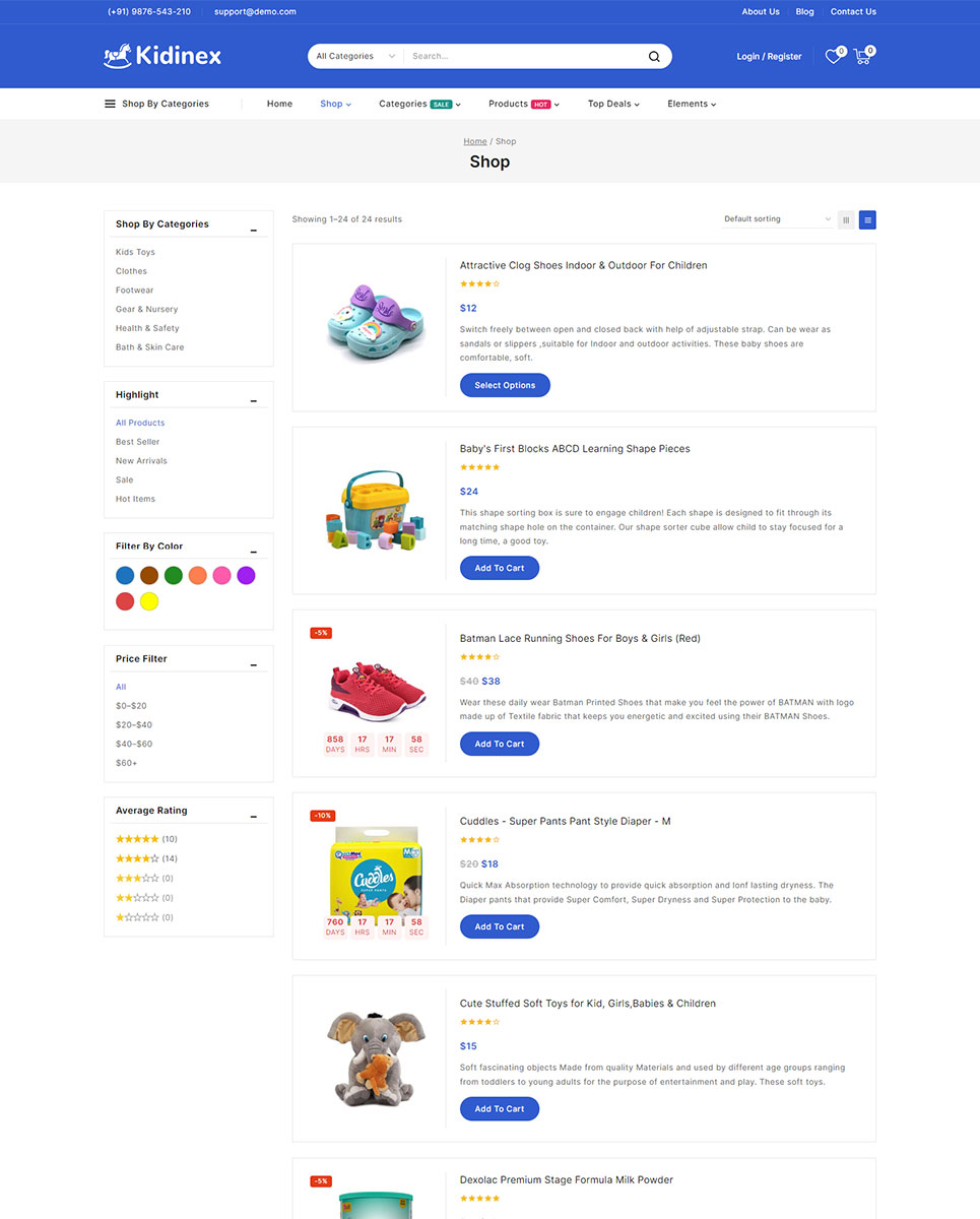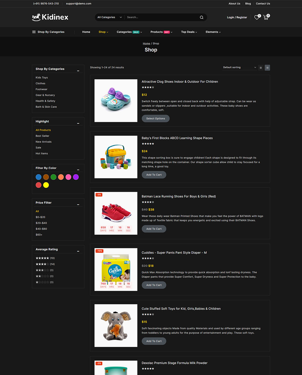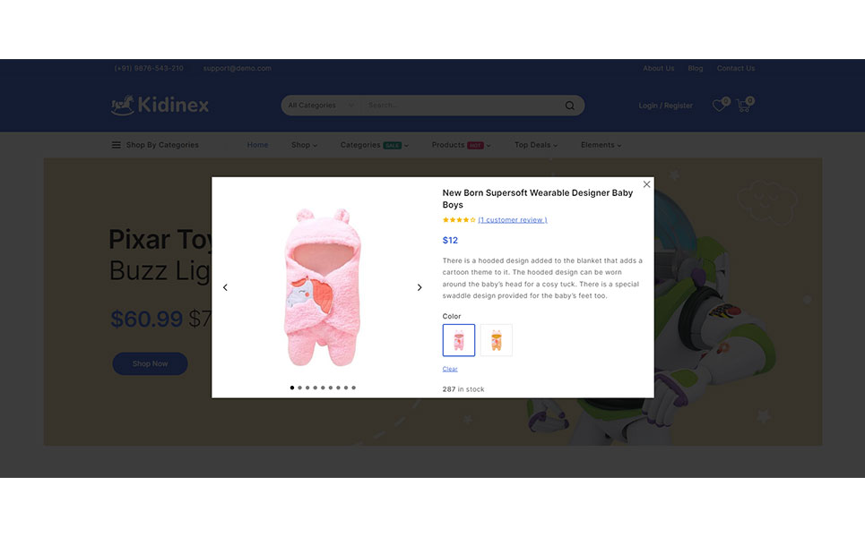 The Kidinex - Baby Care and Toys Store Elementor WooCommerce Responsive Theme is a specialized WordPress theme designed for online stores that focus on baby care products, kids fashion boutiques, gift shops, baby apparel shops, toys and related items. Kidinex combines a charming, child-friendly design with robust e-commerce functionality to help you create a delightful and efficient online shopping experience for parents and caregivers.