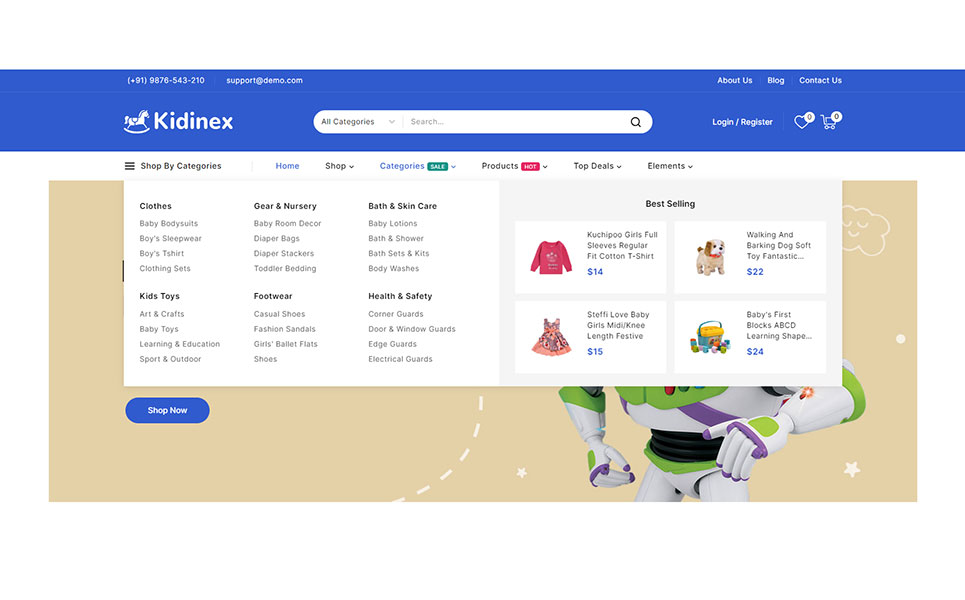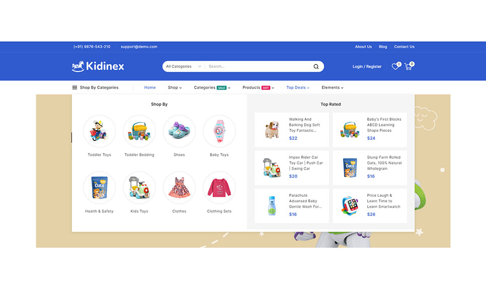 Showcase your baby care products and toys with style using various display options. Kidinex includes multiple product showcase layouts that help highlight key features and attract potential buyers. Provide an exceptional navigation experience with the powerful mega menu. Display extensive menu options in a clear and organized manner, making it easy for customers to find and explore different categories and products.