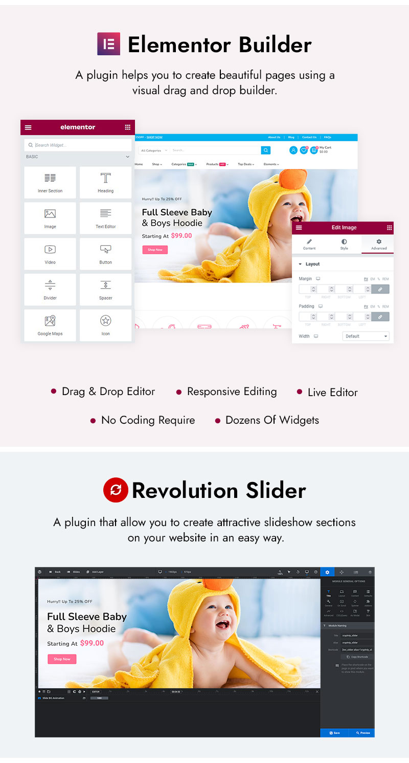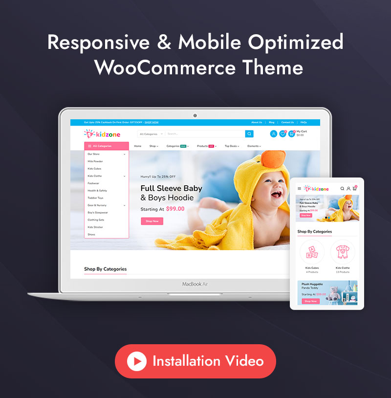 Kidzone - Kids Care and Toys Store Elementor WooCommerce Responsive Theme is a bright, cheerful, and fully responsive WordPress theme designed for online stores selling baby care products, toys, kids' fashion, educational games, and accessories. Built with the intuitive Elementor Page Builder, Kidzone offers powerful customization options and drag-and-drop flexibility, allowing store owners to create beautiful layouts with ease — no coding required.