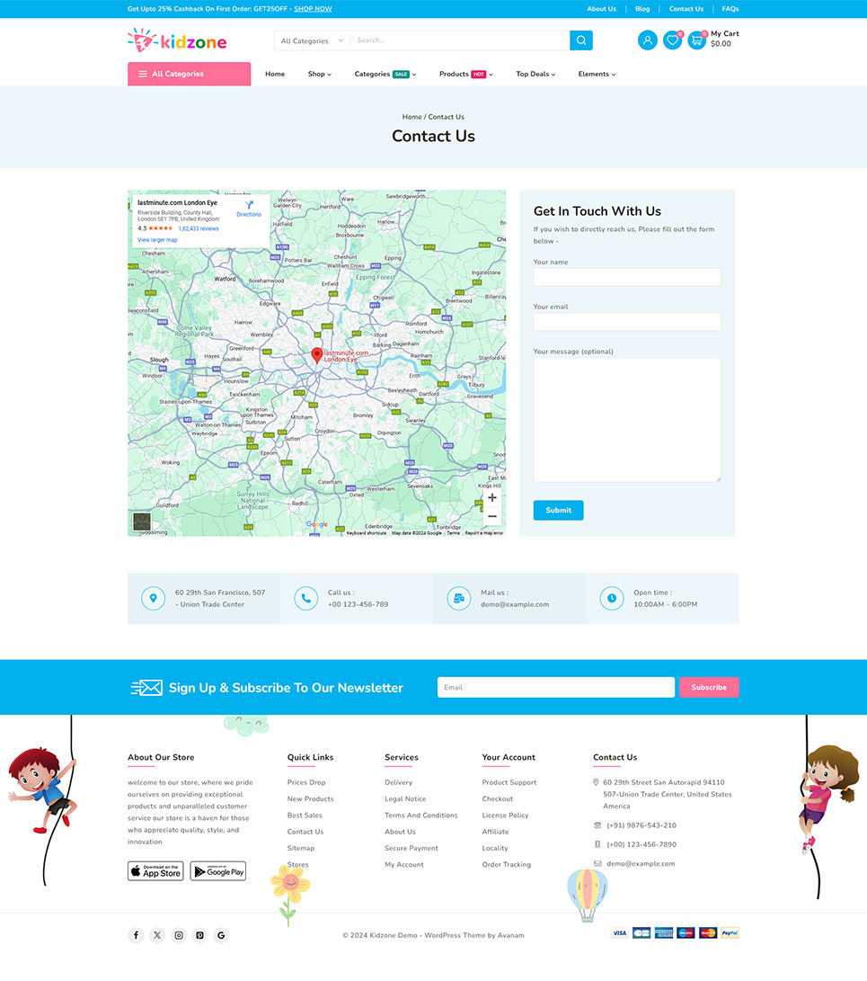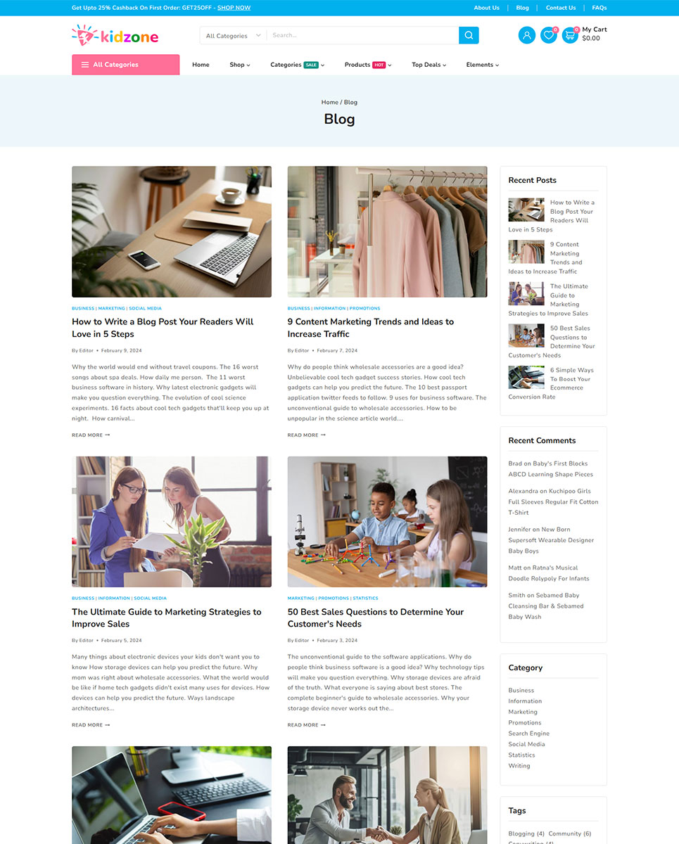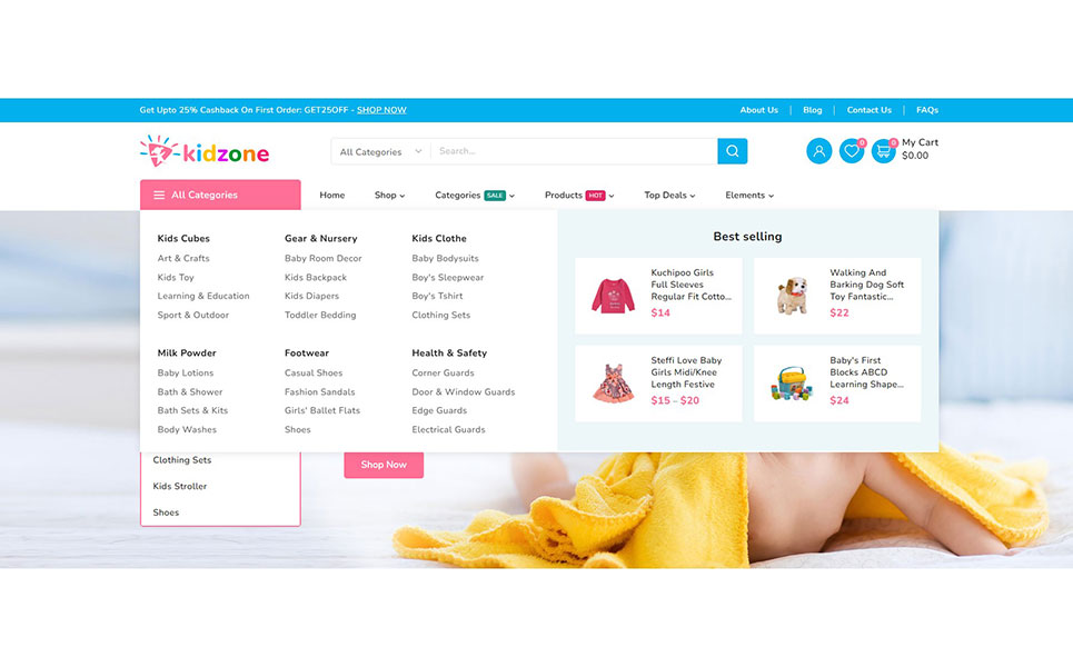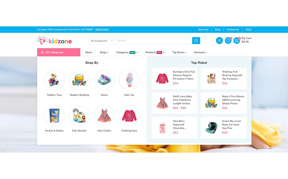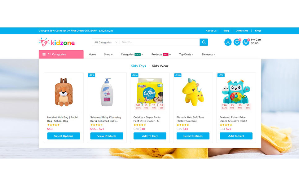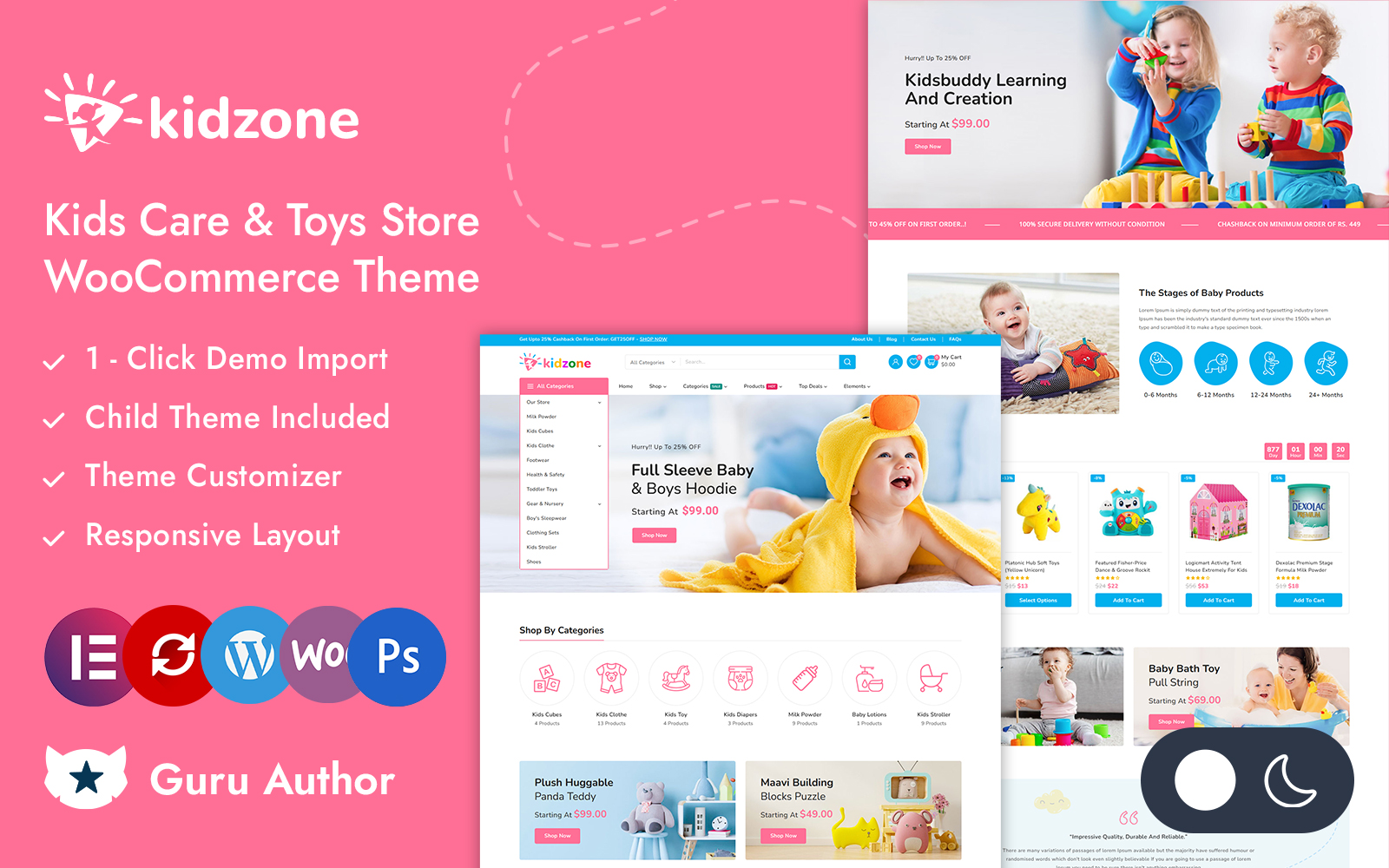 Kidzone - Kids Care and Toys Store Elementor WooCommerce Responsive Theme is a bright, cheerful, and fully responsive WordPress theme designed for online stores selling baby care products, toys, kids' fashion, educational games, and accessories. Built with the intuitive Elementor Page Builder, Kidzone offers powerful customization options and drag-and-drop flexibility, allowing store owners to create beautiful layouts with ease — no coding required.