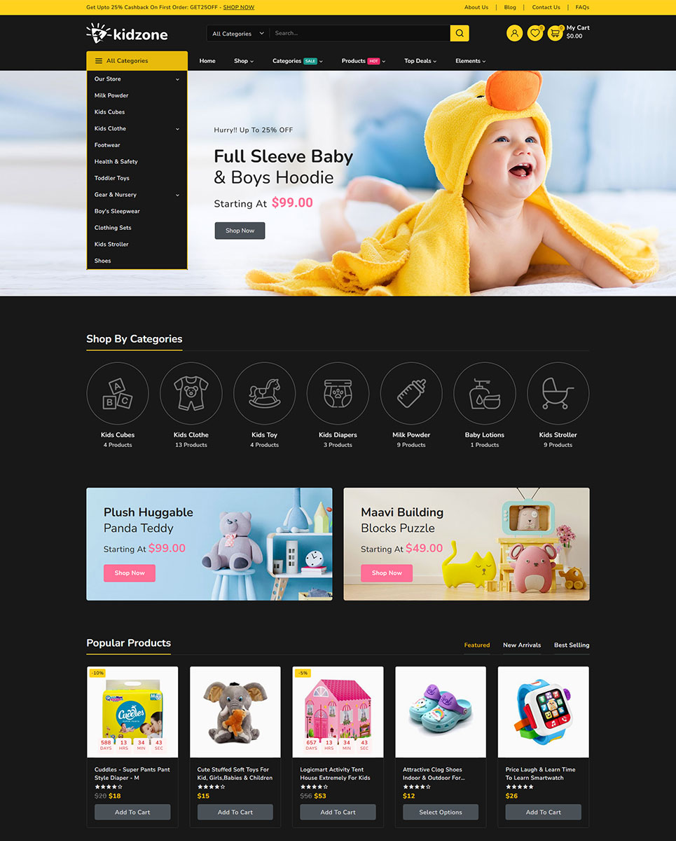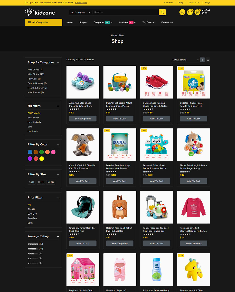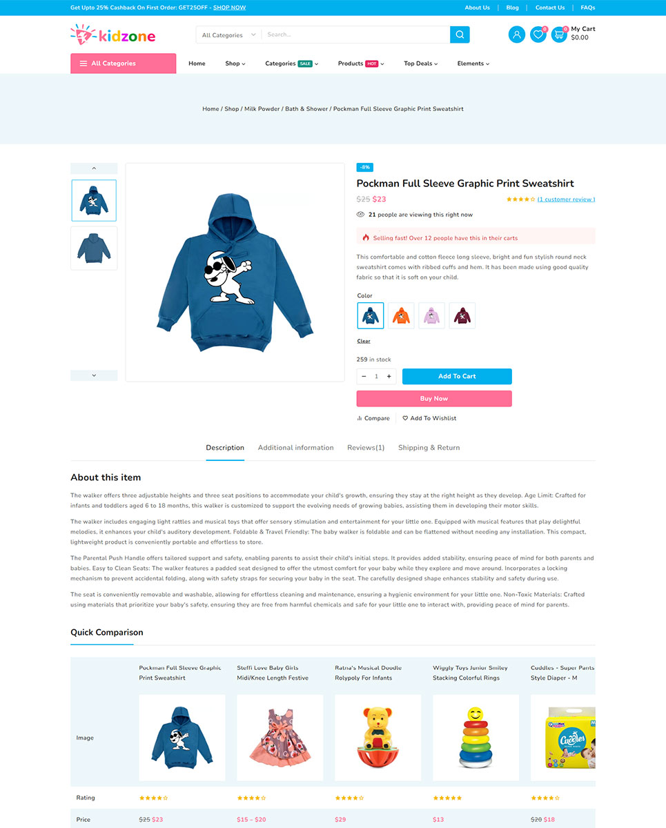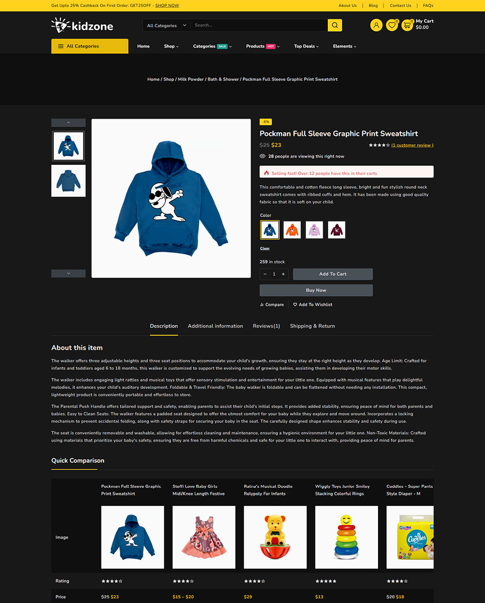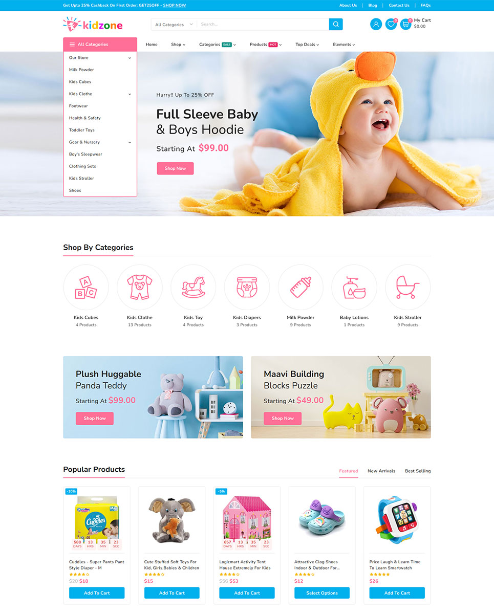 Kidzone includes pre-built homepage, attractive banner sliders, and category-wise product sections to help you highlight your best-selling and latest items. It also comes with AJAX-powered search, product filters, quick view, wishlist, and compare functionality, making the shopping experience smooth and interactive for users.