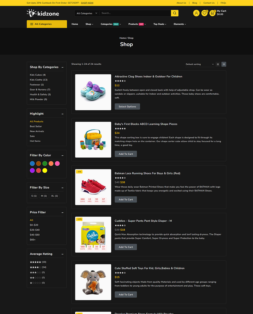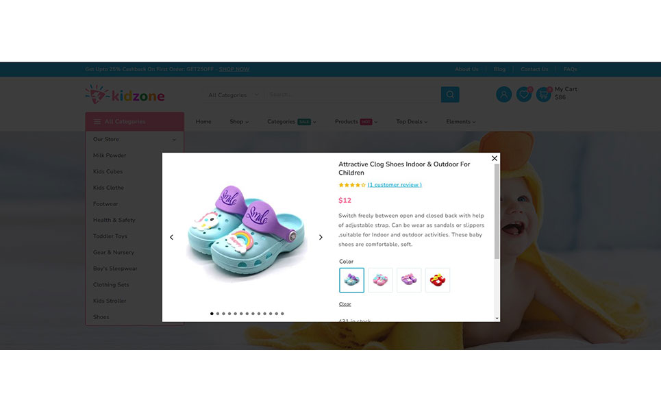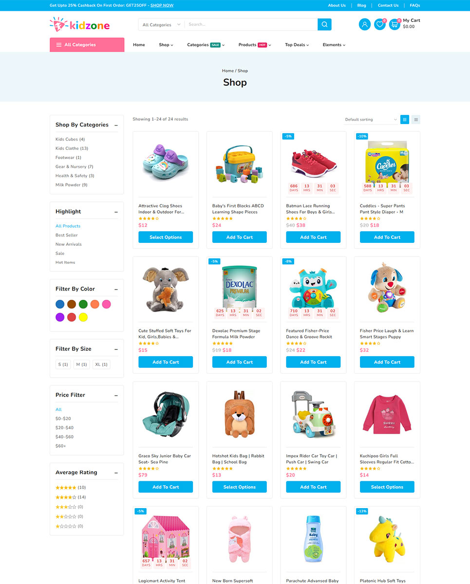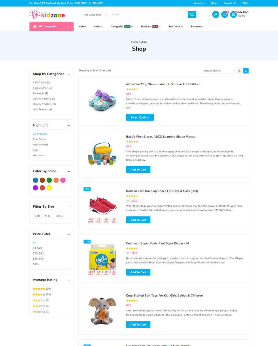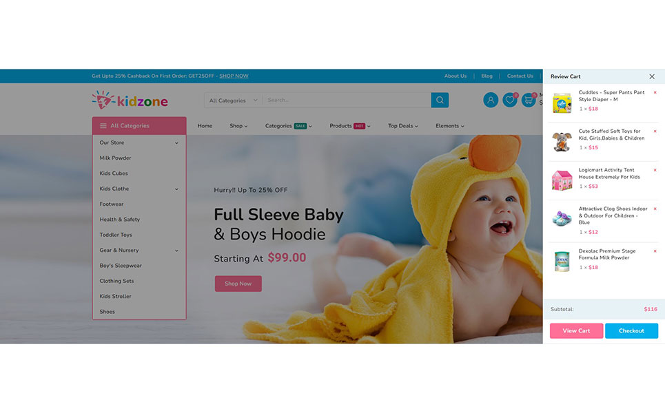 Kidzone includes pre-built homepage, attractive banner sliders, and category-wise product sections to help you highlight your best-selling and latest items. It also comes with AJAX-powered search, product filters, quick view, wishlist, and compare functionality, making the shopping experience smooth and interactive for users.