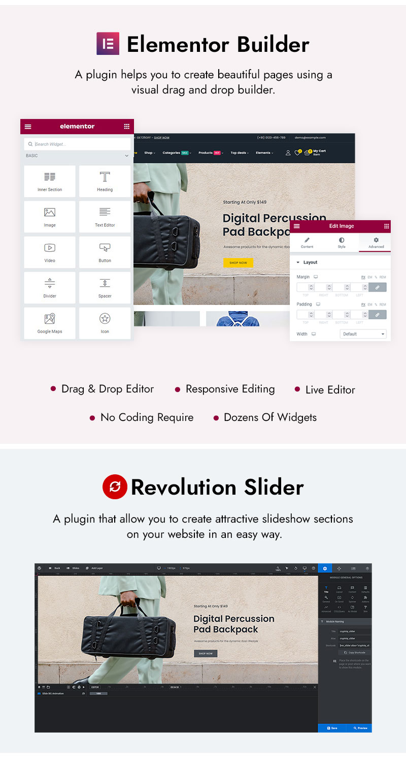 Create and customize your web pages effortlessly with Elementor, the leading WordPress page builder. Its intuitive drag-and-drop functionality allows you to design complex layouts without any coding knowledge, giving you full control over the appearance of your site. Engage your visitors with dynamic and responsive sliders using the Revolution Slider plugin. Labags seamlessly integrates with WooCommerce, the most popular e-commerce platform for WordPress.