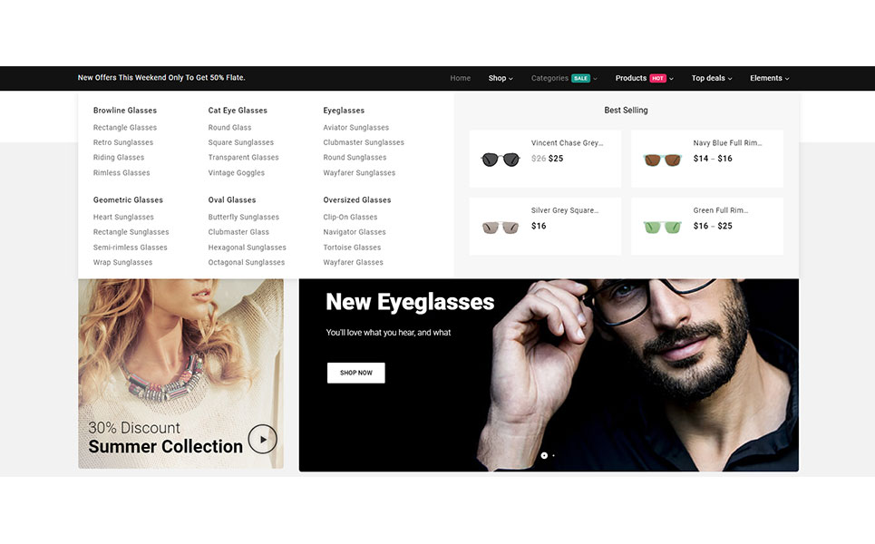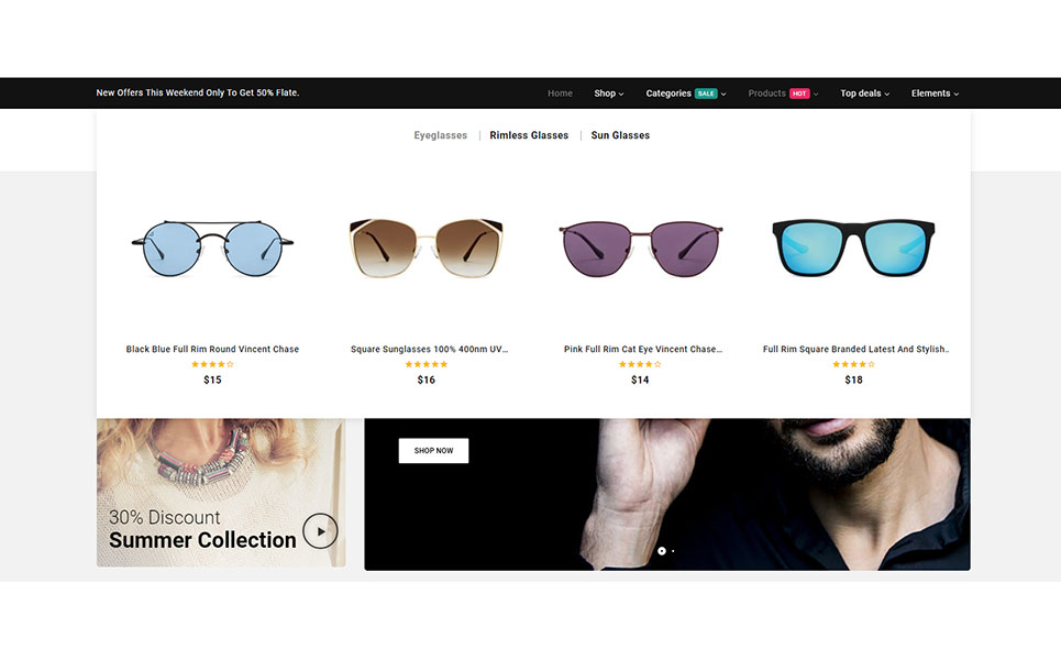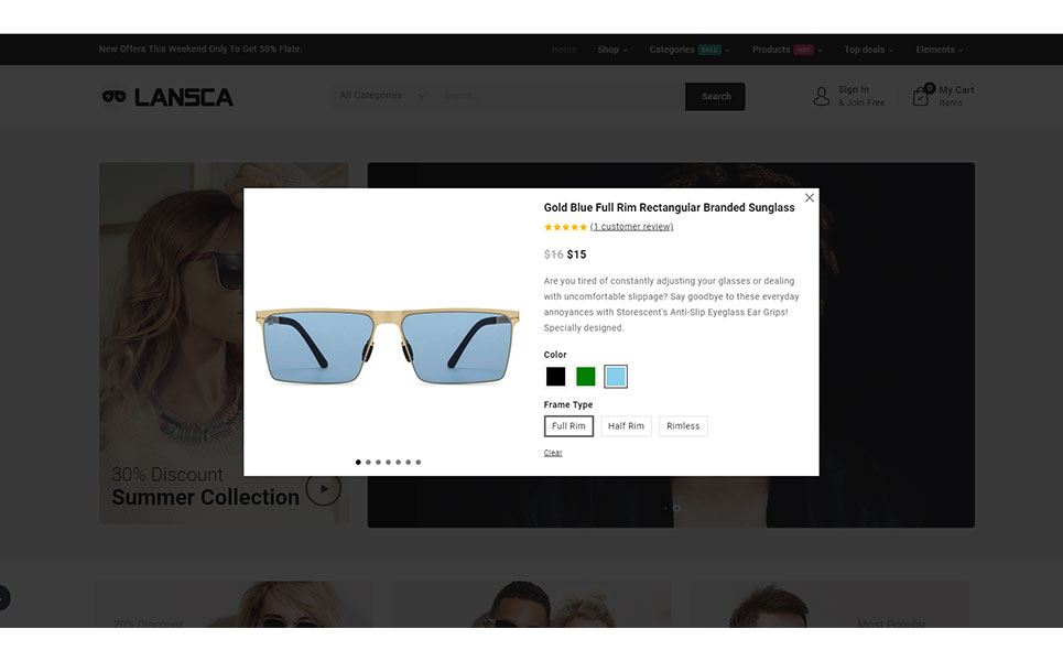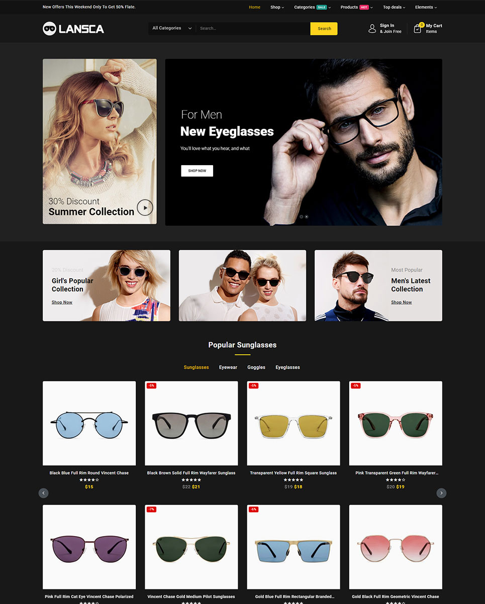 "Lansca," an innovative and sleek Elementor-based WooCommerce theme designed for Eye Glasses, Googles, Sunglasses and Fashion stores. This theme looks really nice with its clean and professional look with black and white color combination. It's also multipurpose which can be used for any types of online store. Lansca combines a clean and modern layout with advanced features. Embrace a clean and minimalist design that puts your eye glasses front and center, creating a visually appealing and distraction-free shopping experience.