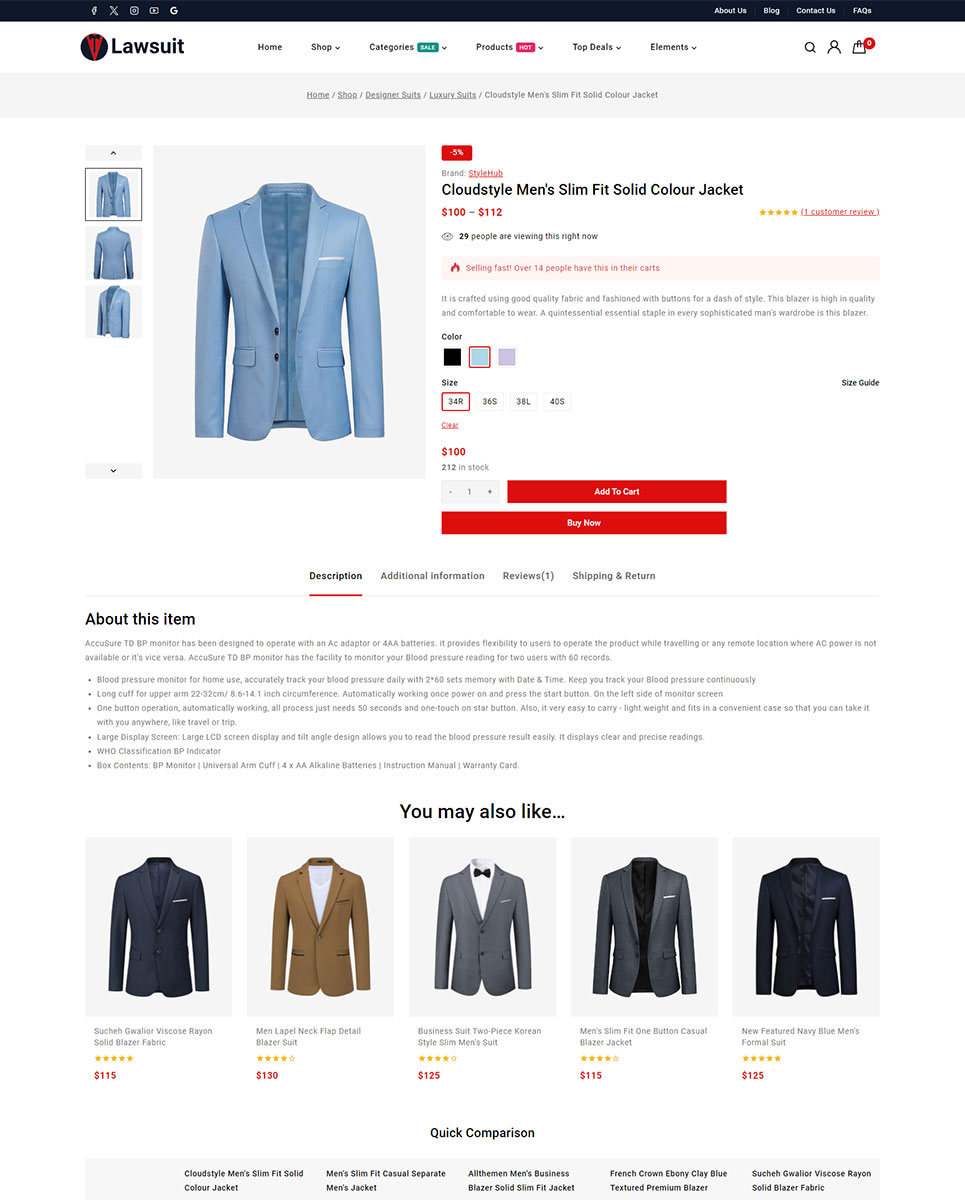 Lawsuit is a sophisticated and stylish Suits & Blazers Store Elementor WooCommerce Responsive Theme designed to cater to fashion retailers specializing in clothes fashion. With a blend of elegant design and powerful features, this theme offers a seamless shopping experience for your customers. Using this theme layout you can highlight your products’ quality and craftsmanship, ensuring a polished and professional online presence.