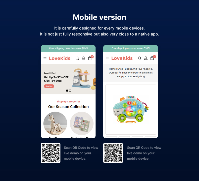 Lovekids features a bright, colorful design that sparks curiosity and excitement. Its clean layouts, fun typography, and lively imagery create a friendly atmosphere that appeals to both kids and adults. Fully responsive and retina-ready, Lovekids ensures your store looks fantastic on all devices, from smartphones to desktops.