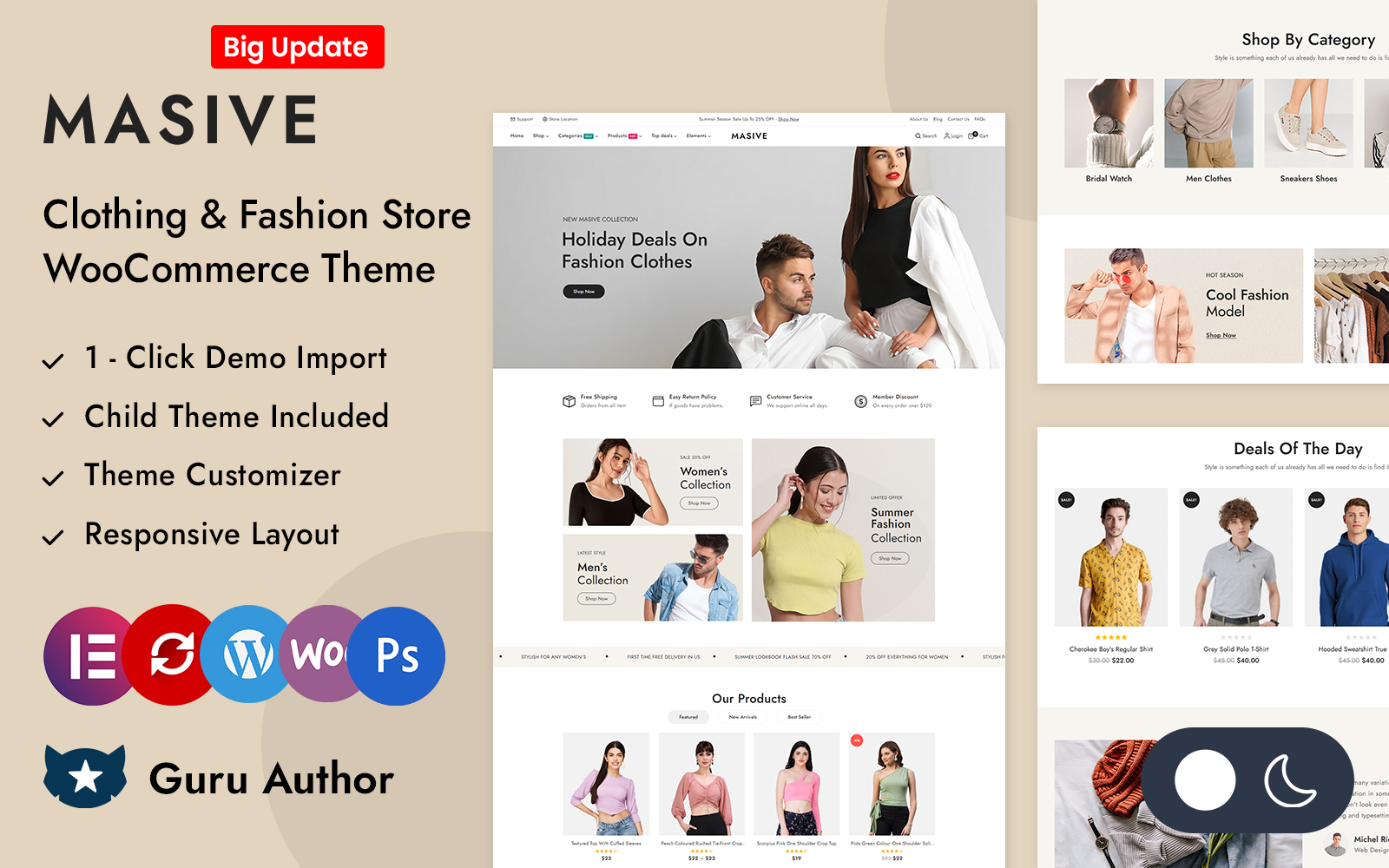 The theme is most likely designed to work in conjunction with the Elementor page builder, allowing users to create unique layouts and designs using a drag-and-drop interface. The theme features the dynamic and adaptable. Revolution Slider plugin, which allows you to build stunning banner sliders and slideshows for product advertising. Masive is optimized for WooCommerce plugin that help you to easily set up an e-commerce store, manage products, and process checkout to complete order process. Ajax technology is used in the theme to create smooth and dynamic user interactions.