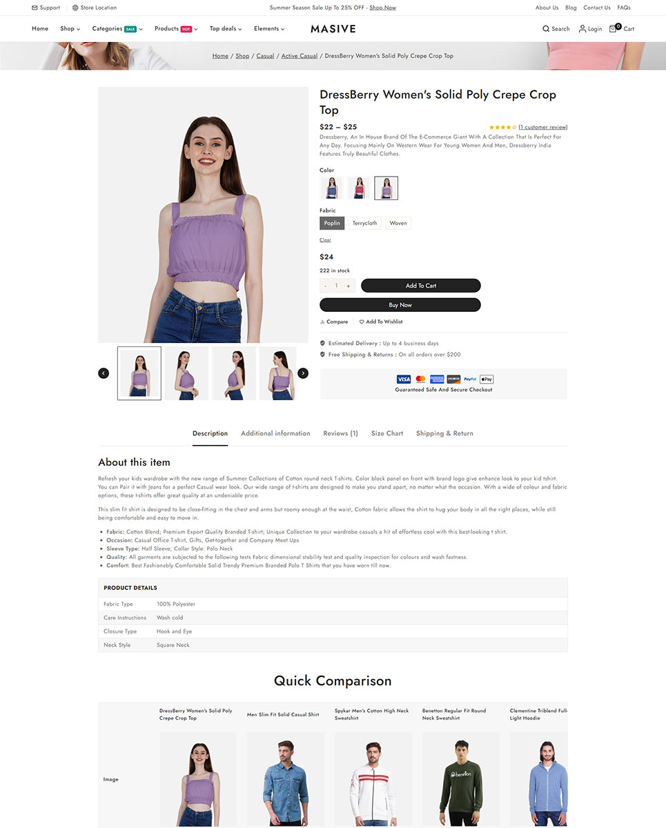 Enable customers to explore your products in detail with Masive's built-in product zoom feature, allowing them to zoom in on images for a closer look at fabric textures, intricate designs, and fine details. With product variant options, shoppers can choose from different sizes, colors, and styles, ensuring that they find the perfect fit for their personal style and preferences. Masive theme prioritizes fast-loading pages, ensuring that your customers have a seamless and swift experience. Elevate user satisfaction and boost your website's performance.
